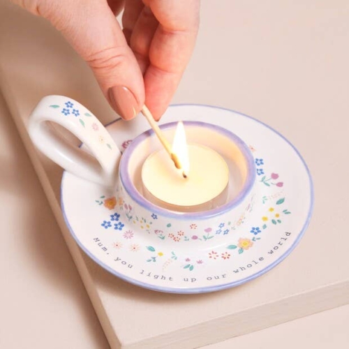 Not available to EU CustomersThe centre of the holder is raised, giving enough room to hold a tealight or even a larger pillar candle inside. Adorning the edge of the candle holder is the quote ‘Mum, you light up our whole world’, so you can gift this home accessory to her and be sure she feels adored.This holder is complete with a handle so it can easily be transported throughout the house. Dimensionswidth 11.5cm x height 5.5cm
