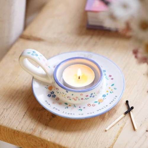 Not available to EU CustomersThe centre of the holder is raised, giving enough room to hold a tealight or even a larger pillar candle inside. Adorning the edge of the candle holder is the quote ‘Mum, you light up our whole world’, so you can gift this home accessory to her and be sure she feels adored.This holder is complete with a handle so it can easily be transported throughout the house. Dimensionswidth 11.5cm x height 5.5cm