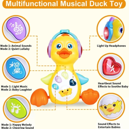 Baby Musical Duck Toys: With its delightful crawling and playful music, the dancing duck toy is guaranteed to delight little ones. The Crawling Tummy Time Light Up duck toys are perfect for improving hand-eye coordination and motor skillsMusical Flapping Yellow Duck Toy: The dancing walking duck’s infrared sensor helps it to avoid obstacles, encouraging newborn babies to crawl and reach for it, improving their motor skills. The cute duck can help stimulate children’s physical movement and coordination.High-quality Material: Made from non-toxic ABS material, with smooth edges and no burrs, the crawling duck toy is safe for babies to play with. The dancing duck toys are also durable enough to withstand bumps and fall, and can help make the tummy time fun and happy for little ones.SUPER VALUE PACK for Baby Gift: Perfect for Holiday Toy Gifts, present, School Classroom Prize, Kids Intelligent Learning Toys, Easter Stuffer, Baby Toy Duck, Baby Shower and more.This crawling duck baby toy is the perfect gift for babies and toddlers, helping to stimulate their imagination and creativity. The toys for baby boys and girls are great for birthdays, Christmas, and other special occasions, and can even entertain your pets.Great Educational Toy: Best Choice for baby! Lovely gifts for any baby. Adorable and entertaining action educational first toy, Baby Activity Play Center, Pre-Kindergarten Toy! Help hone your kid’s mental and physicals skills with this fun yet educative learning toy for babies. Children can play this flapping yellow duck toy freely and safely without parents’ supervision.