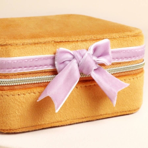 Charming jewellery case made of rich mustard velvetFeatures a playful pink ribbon and bow detailIncludes ring rolls and small compartments for organisationIdeal for retailers offering gifts for accessory loversDimensions: width 11.5cm x height 5.5cm x depth 11.5cm inner height – 3cm ring section width – 8cmMade from: velvet, metal