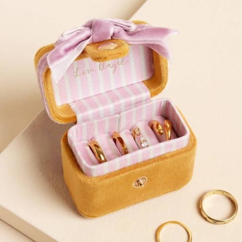 Compact ring box made of plush mustard velvetFeatures a large pastel pink bow on the topPlush interior designed to keep rings safeIdeal for retailers offering easy storage solutions as giftsMade from: velvet