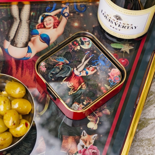 A set of 4 square red and gold coasters with a Myrtle and Mary Fifi design, part of our Myrtle and Mary collection of trays and coasters. Designs by Myrtle and Mary. Container dimensionsHeight : 3cm, Width : 11cm, Depth : 11cmCoaster dimensionsHeight : 0.5cm, Width : 10cm, Depth : 10cm