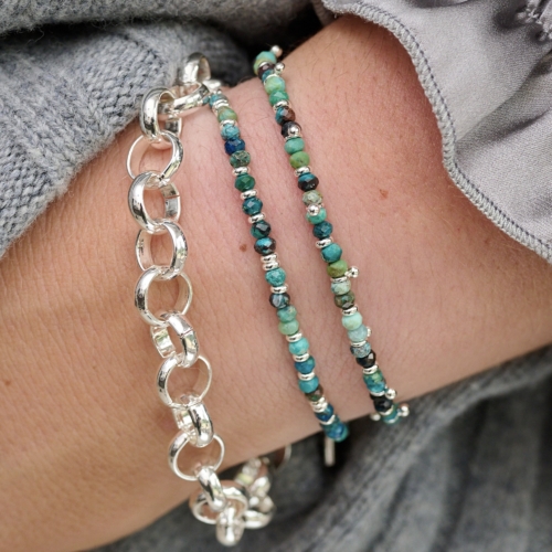 A little gem from our wellness range, this silver plated bracelet is loaded with beautiful Azurite blue stones. Azurite is a healing Master Stone, which cleanses and strengthens the emotional body, releasing stress and worry, and overcoming grief and sadness. Azurite also lends the courage to overcome negative patterns of behavior stemming from insecurity and fear. For comfort and adaptability, it comes with an adjustable slider mechanism, making it suitable for most wrists. Made with .925 Silver plate on brass, length is up to 26cm. Boho Betty items come beautifully packaged, the perfect gift for someone special or for treating yourself!
