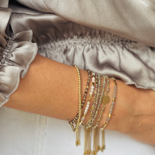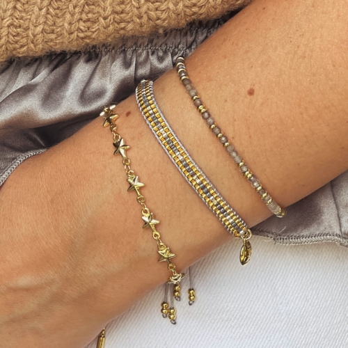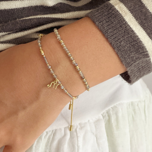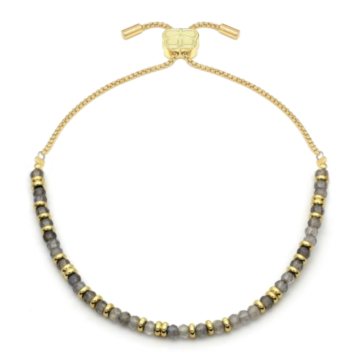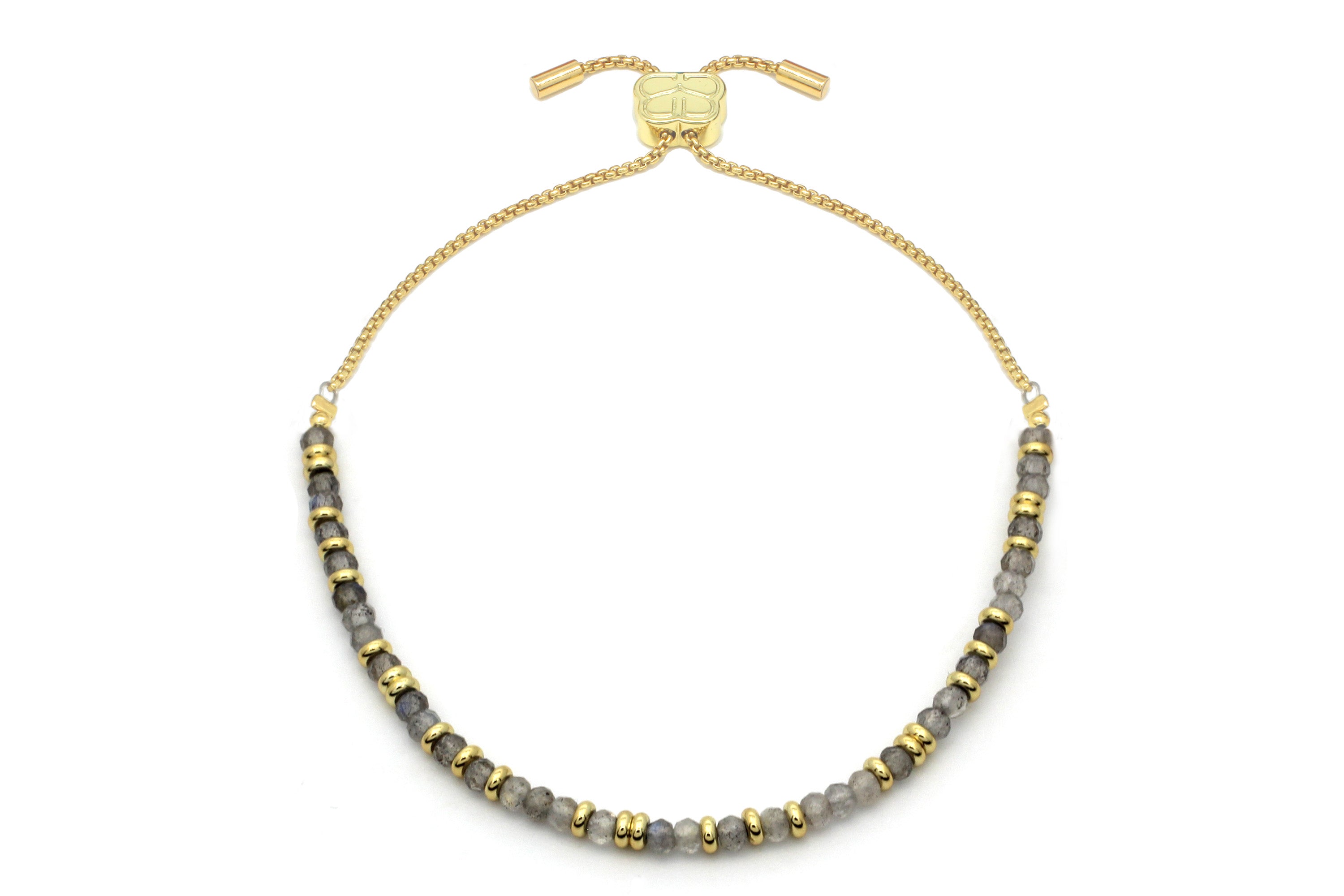 ITEM AVAILABLE TO PRE ORDER FOR DELIVERY MID APRIL 2024 A little star from our wellness range, this gold bracelet is loaded with stylish soft grey labradorite gemstones. Known as the ‘Stone of mysticism’, labradorite is believed to bring clarity to your inner self, to restore strength and perseverance, to encourage truth and peace, to promote sound sleep. For comfort and adaptability, it comes with an adjustable slider mechanism, making it suitable for most wrists. Made with 12k gold plate on brass, length is up to 26cm. Boho Betty items come beautifully packaged, the perfect gift for someone special or for treating yourself! RRP £28.00