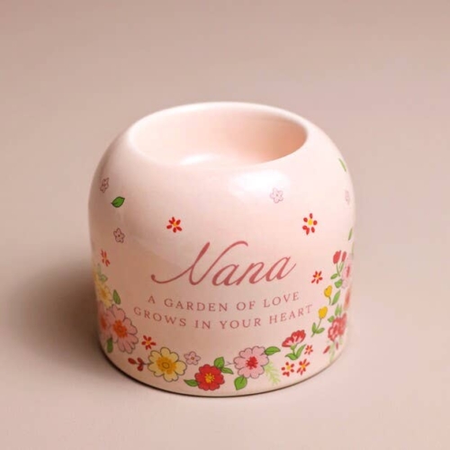 Not available to EU Customers.Reading ‘Nana a garden of love grows in your heart’, this sweet little tealight holder is certain to make her smile. Made of sturdy ceramic in a pale pink shade, this floral patterned candle holder will look sweet placed on her shelf or side table.Dimensionswidth 9cm x height 6.5cm x depth 7cmMade fromceramic