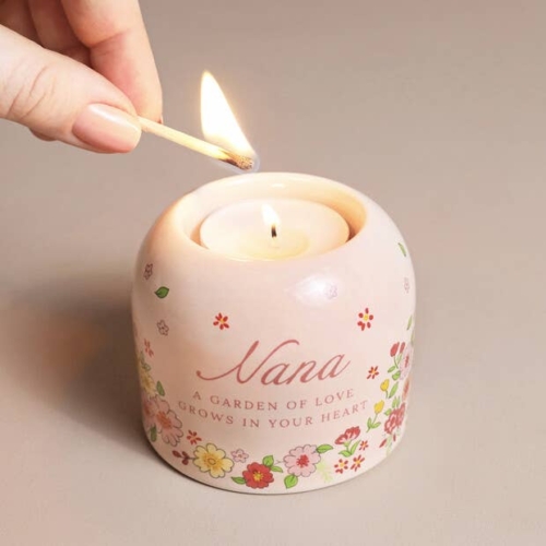 Not available to EU Customers.Reading ‘Nana a garden of love grows in your heart’, this sweet little tealight holder is certain to make her smile. Made of sturdy ceramic in a pale pink shade, this floral patterned candle holder will look sweet placed on her shelf or side table.Dimensionswidth 9cm x height 6.5cm x depth 7cmMade fromceramic