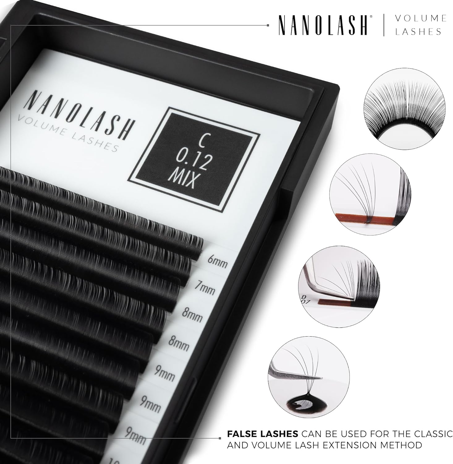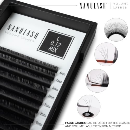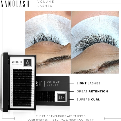 ✅ LIGHT LASHES – The top-quality fibers ensure incredible lightness and flexibility of the lashes, making them imperceptible when worn. ✅ GREAT RETENTION – The high quality of Nanolash Volume Lashes ensures an extended lifespan of your lash look. The lashes stay on for a long time. ✅ SUPERB CURL – Nanolash false lash extensions are beautifully curled and retain their shape at all times. ✅ GREAT CHOICE – We offer lash extensions in 40 versions. You can choose a different curl, thickness, and lash length. ✅ EASY TO PEEL – The foil back lash strip is easy to peel off and transfer to a holder to create 2D-8D lash fans efficiently. ✅ MATTE FINISH – The special finish of Nanolash false lash extensions ensures the results are very natural. Product description Discover the beauty of a female gaze with Nanolash Volume Lashes. These false lashes can be used for the classic and volume lash extension methods. The matte finish of the lashes gives them a natural look, making any lash look beautiful. The false eyelashes for volume lash extensions are tapered over their entire surface, from root to tip. The lashes are smooth and flexible, they feature high resistance to deformation and blend harmoniously with natural lashes. They are superbly light and subtle, making them completely imperceptible when worn. Nanolash Volume Lashes come in two types of curl – C and D. There are as many as 40 different variants of false lashes, divided by curl, thickness, and length, so professional lash artists can easily select specific lashes for their chosen extension method. Nanolash eyelash extensions are the perfect way to achieve beautiful eyelashes for many weeks and ensure the satisfaction of every lash artist and her clients. Safety Warning For external use only