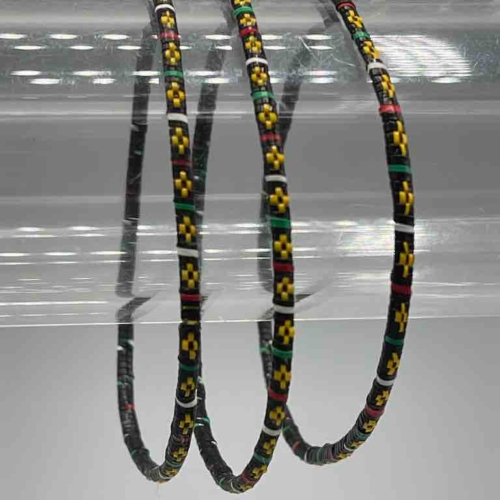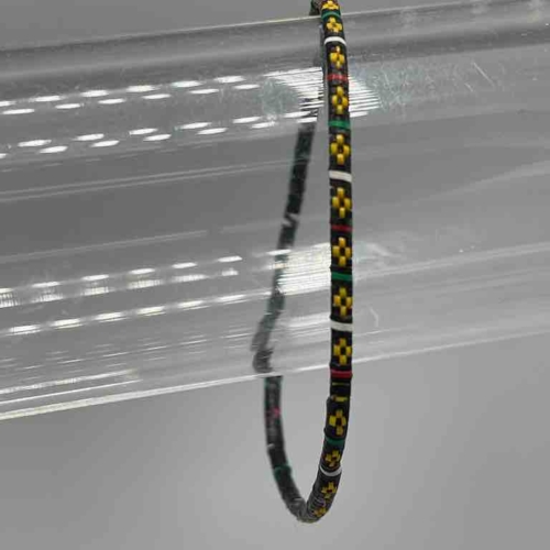 The foundation of this bracelet is very thin black plastic thread, acting as the weft – wound tightly around a bamboo base. Fulani women artisans in the most rural areas of Mali create, completely by hand, the extraordinarily detailed patterns by intricately weaving a design with a contrasting color – yellow in this case – as the warp. This quality is rare; the level of detail and beauty of each bracelet is stunning. We are unable to achieve by our photography an accurate representation of the fineness of the detail of these amazing very thin bracelets. The internal diameter is approximately 2 1/4″ (5.7 cm) x 1/16″ wide (1.6 mm)