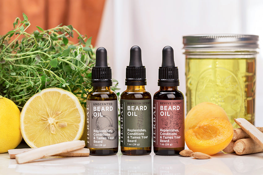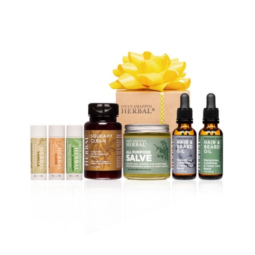 Natural skin care makes the perfect thoughtful gift for any man, especially when it is eco friendly, small batch, and made in the USA. This intentionally crafted set contains Squeaky Clean Powder Cleanser, Beard and Hair Oil in Refresh Scent& Unscented, All Purpose Salve, and three of our herbal infused lip balms.