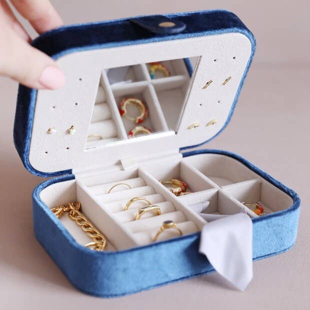 This gorgeous jewellery storage case in soft navy velvet is the perfect way to keep prized pieces safe and secure while on your travels!In a curved rectangular shape with a smooth cream inside, both halves of the case are attached together at the back, so the case falls open when undone. A small gold popper securely fastens the case, and the inside is filled with four small compartments, one larger compartment, and a row of ring rolls for securely holding rings or earrings in place. width 16cm x height 5cm x depth 10cm