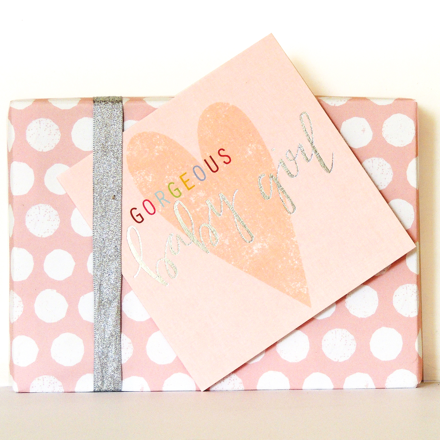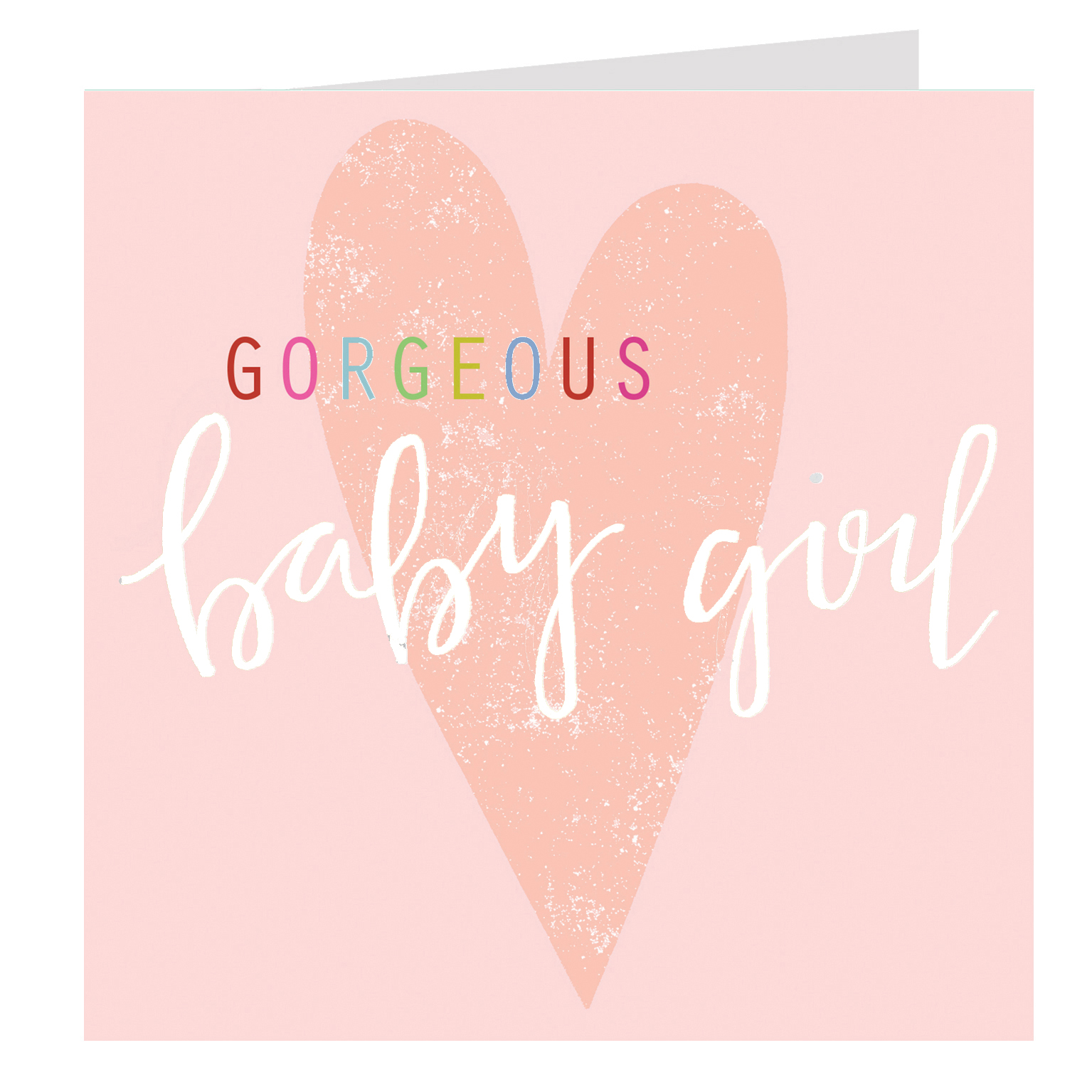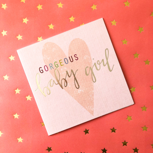 A ‘gorgeous baby girl’ card to welcome a little one into the world. Set on a soft pink background with ‘baby girl’ in silver foiled calligraphy to make this delightful card extra special.