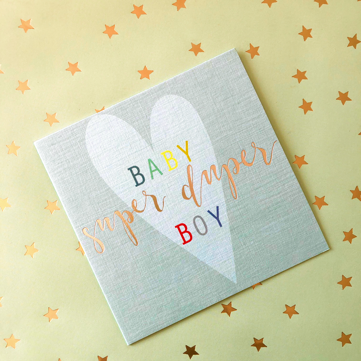 A ‘super duper baby boy’ card to welcome a little one into the world. Set on a soft blue background with ‘super duper’ in silver foiled calligraphy to make this delightful card extra special.