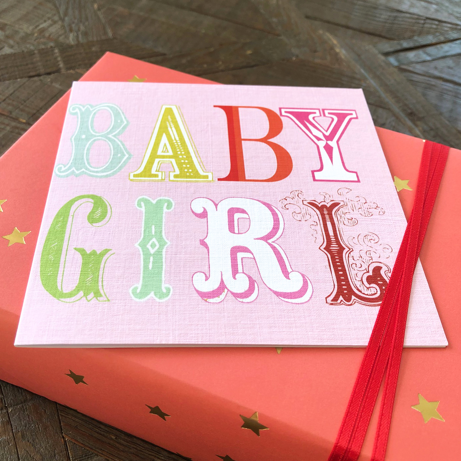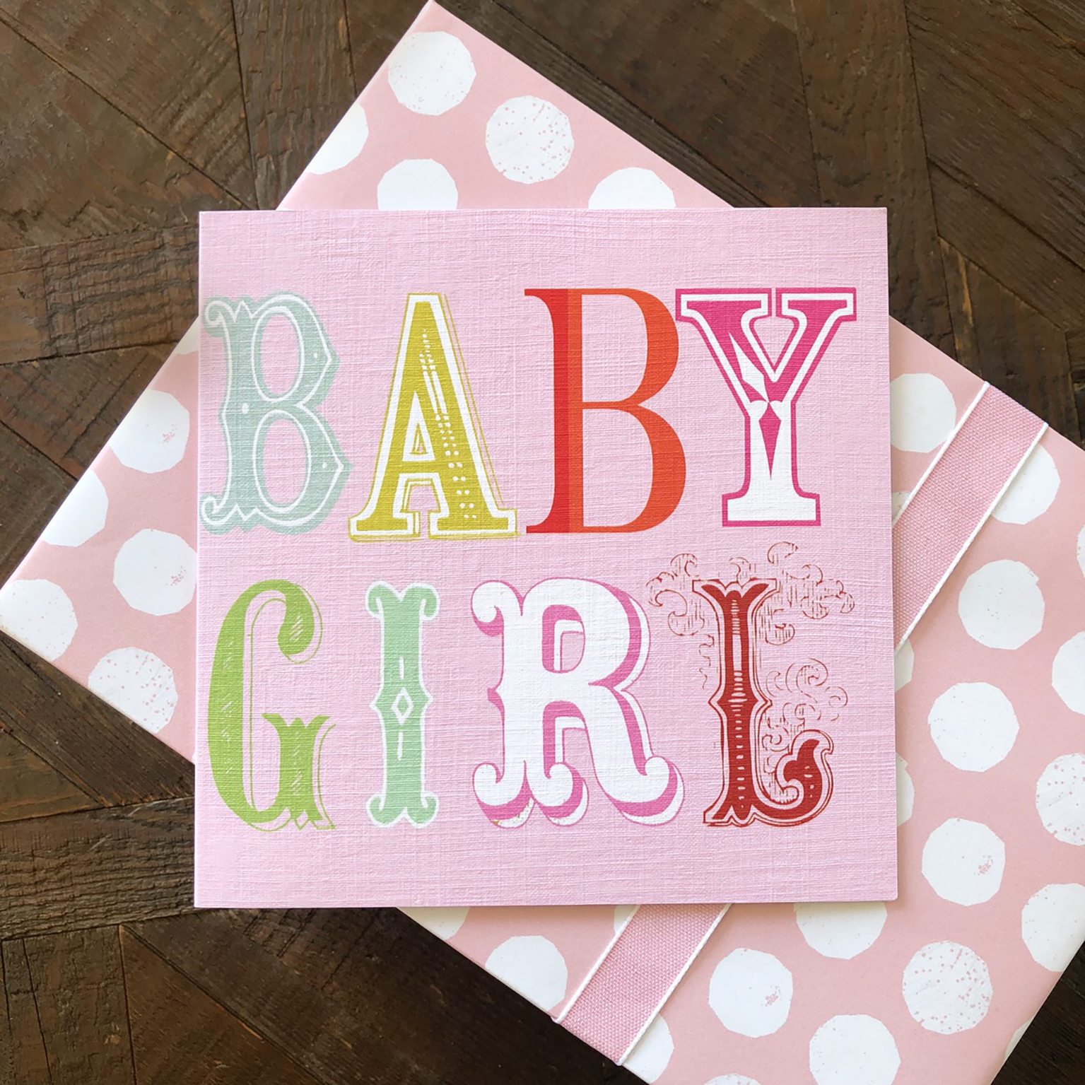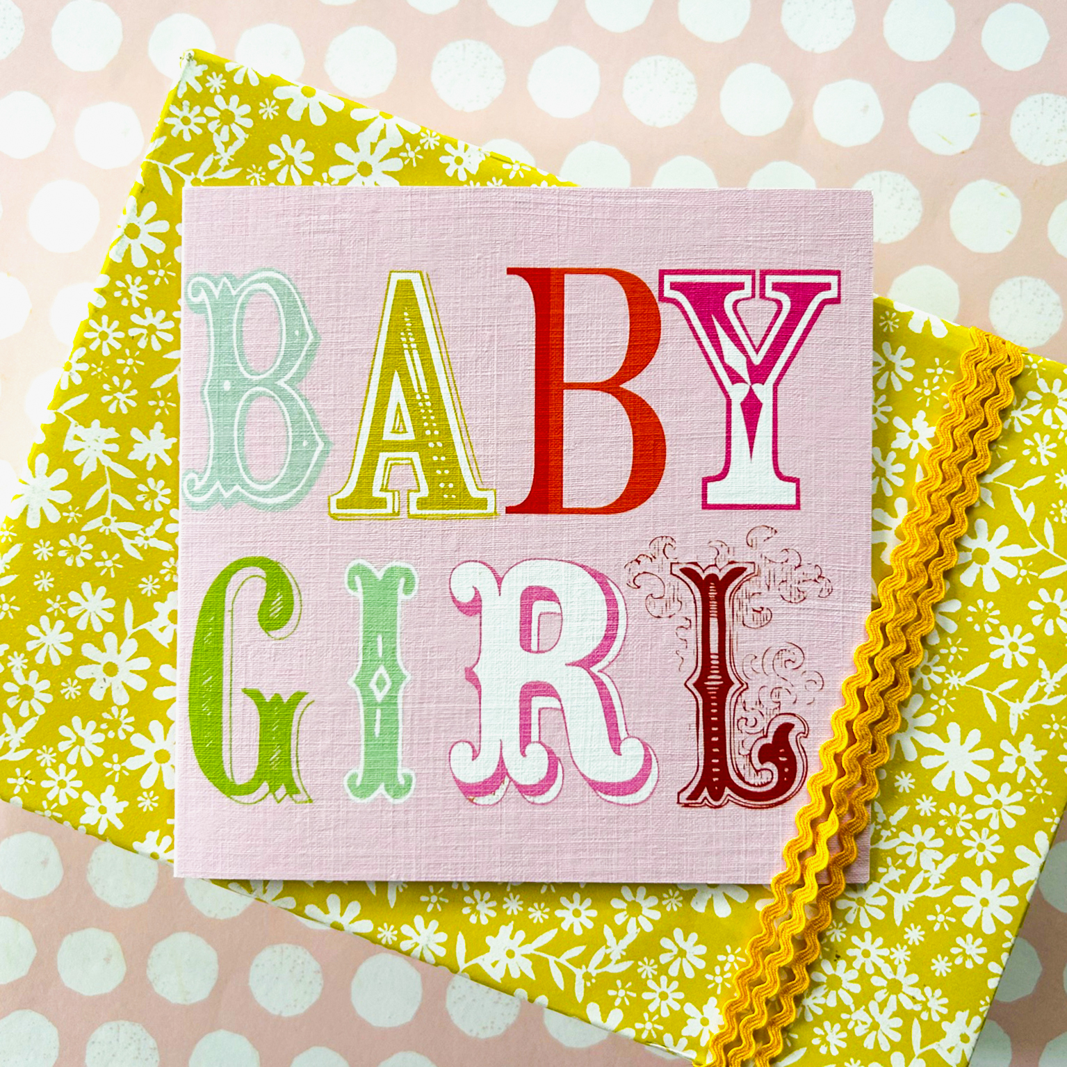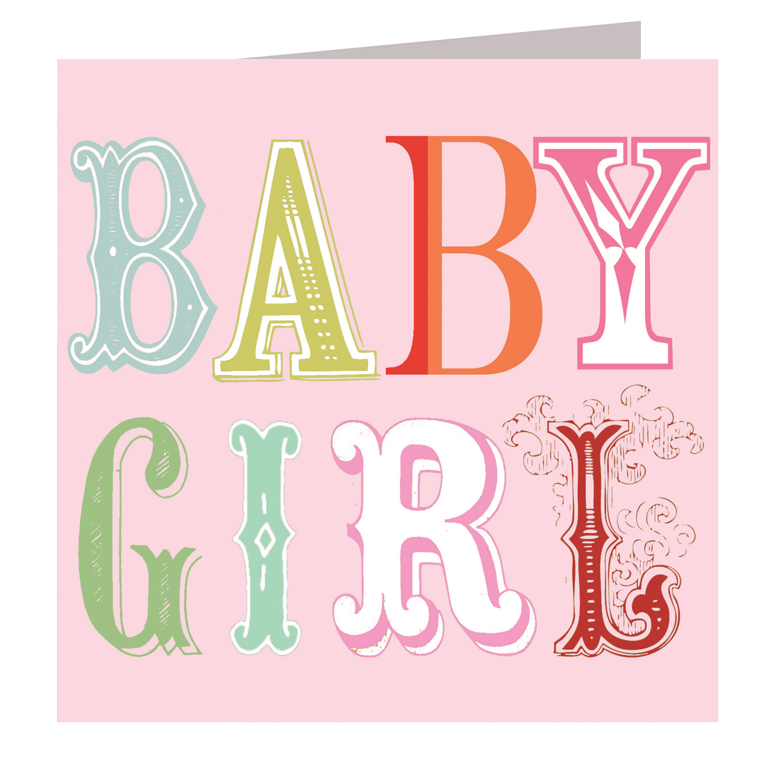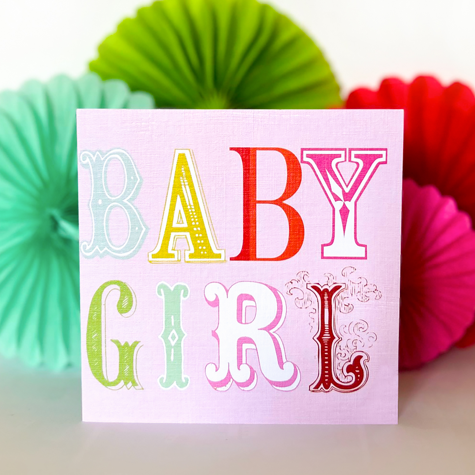 A gorgeous baby girl card to welcome a little one into the world. Set on a soft pink background with a fun mix of fonts.