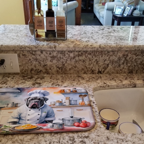 Dish Drying Mat featuring breed specific Neapolitan Mastiff artwork. Say goodbye to messy countertops and soggy dish towels with our innovative dish drying mat. Our high-quality dish drying pad is designed to keep your countertops dry while offering a stylish and efficient solution. Whether you’re air drying dishes, glasses, stemware, silverware, pots, pans, bottles, or even fruits and vegetables, our dish mat is the perfect choice. The 14 inches x 22 inches size fits most counters and dish drying racks, and the non-slip design ensures stability. Made with water-absorbent polyester and a polyurethane foam insert, our dish drying mat is not only functional but also durable. It’s machine washable and printed in the USA for long-lasting use. The beautiful artwork adds flair to your kitchen decor, making it a perfect housewarming gift or present for any occasion. Upgrade your kitchen experience with our absorbent and versatile dish drying mat.