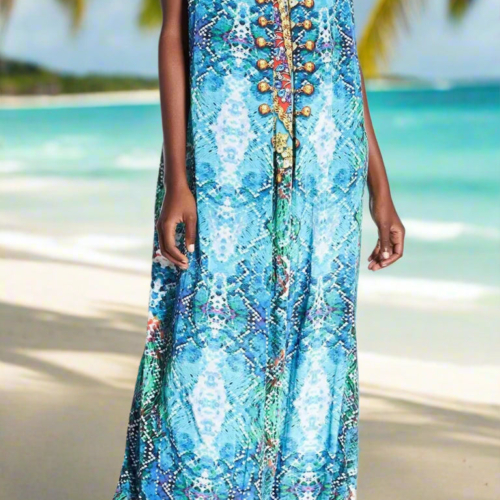 Resort wear from the house of La Moda takes the shape of easy breezy designer dresses. This flowy halter neck maxi dress makes sure you keep up with the latest fashion trends. The collection at La Moda balances ease and elegance in equal measure. • Halter Neck Maxi Dress • Cover Up, • Beachwear, Resort Wear, Cruise • 100% Polyester • Printed, Multi-Color • Size: One Size • Washing Instruction: Hand Wash with Cold Water, Tumble Dry, Do not Iron Pack of 4 Pcs