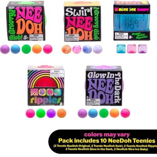 Get groovy with the NeeDoh Teenie 10-Pack! This mini-sized set packs maximum sensory fun, featuring two teenie NeeDoh in each of five featured styles. From bold colors to irresistible textures, every squeeze, squish, and stretch delivers pure satisfaction. Loved by kids and adults alike, NeeDoh helps you relax, focus, and find your groove—whether at home, school, work, or on the go! Safety Warning Choking hazard – small parts, small balls. Do NOT heat, freeze, or microwave, may cause personal injury. Features & details Get groovy with a pack of 10 NeeDoh in teenie size! Want a super solid squish? Want doh-filled sensory satisfaction? Want tactile, swirls and glow? You get it all in this pack of NeeDoh squishies! Includes: 2 Teenie NeeDoh Original, 2 Teenie NeeDoh Swirl, 2 Teenie NeeDoh Ripples, 2 Teenie NeeDoh Glow in the Dark, 2 NeeDoh Nice Ice Baby Color may vary; 10 NeeDoh Teenies per pack; 1.5″ diameter Age: 3+