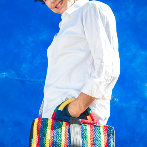 We took the shape and the colourways of the Frevo umbrella to create the handle of the clutch bag, which is made from decommissioned construction wood and excess fabric from the fashion industry, all rescued from their destiny of landfill. The colours of the Frevo umbrella extend into the main body of the bag to represent the positive radiance of colour that showers the streets during carnival during the Frevo dance. Fashioning kindness is at the heart of our company, The design of the Nene clutch bag encompasses the idea to pass on positivity to every person who makes, wears or even sees it, just like how the Frevo umbrella showers positivity on the streets during carnival.