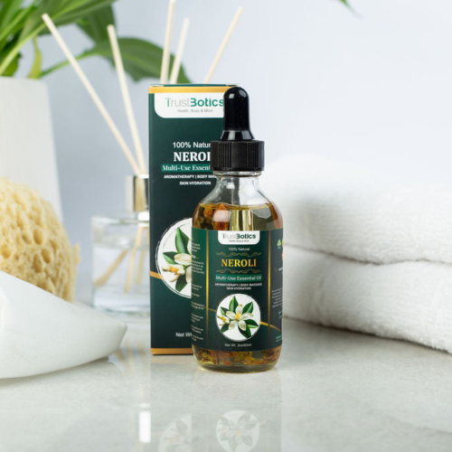 Soft citrus meets delicate floral bliss. Neroli Multi-Use Essential Oil by TrustBotics (60ml) is a ready to use blend, distilled from the blossoms of the bitter orange tree. Known for its soft, citrus-floral scent, it brings a sense of gentle refinement to your skin care and self-care rituals. Neroli Multi-Use Essential Oil Properties Bright & Uplifting Aroma – A radiant fusion of citrus and floral notes that awakens the senses and adds elegance to your daily rituals. Skin Glow & Hydration – Absorbs quickly, lightweight botanical oils leave the skin nourished, smooth, radiant and luminous with every application. Unwind & Evening Rituals – A delicate fragrance that sets a sense of peace, making it perfect for unwinding and mindful self-care moments. Ideal addition to your night time routine. Romantic & Luxurious Touch – A timeless floral scent often associated with refinement, closeness, and indulgent rituals Refreshing Citrus Burst – Neroli’s invigorating citrus-floral scent provides a natural burst of freshness, perfect for starting the day with a bright, elegant floral touch Balancing Daily Rituals – Ideal companion for morning skincare, body care, or layering with other beauty essentials to elevate your routine Multi-Purpose Use – Apply directly to skin or hair, use in massage, aromatherapy or mix with your favourite care products for an extra touch of indulgence Fragrance Layering – Pairs beautifully with other scents to create a sophisticated atmosphere Hair & Body Care – Nourishes hair and skin with a lightweight, radiant finish Pre-Blended Formula – Use directly on skin for effortless beauty and daily care. Enjoy straight from the bottle. Base Oils – Jojoba oil, camellia japonica seed oil, cold-pressed castor oil Format – 60ml premium glass bottle, ready to use TrustBotics Neroli Multi-Use Essential Oil is a luxurious ready-to-use lightweight formula glides smoothly onto the skin, leaving it nourished, silky, and radiant. Neroli’s luminous fragrance is perfect for freshness mornings and peaceful evenings, designed for you to create an elegant atmosphere at any time of day. Whether layered on skin, added to a body ritual, or enjoyed as a fragrant touchpoint, Neroli Multi-Use Essential Oil delivers natural beauty and timeless refinement in every drop. Elevate your self-care with TrustBotics Neroli Multi-Use Essential Oil. Add to cart today and experience nature’s most enchanting citrus-floral essence! Natural | Vegan | Botanical Ingredients | Certified by CERES, ISO & FDA – ensuring premium botanical quality, and ethical sourcing. CONTENT: 60ml Ingredients: Crafted with a refined blend of Simmondsia Chinensis (Jojoba) Seed Oil, Camellia Japonica Seed Oil, and Ricinus Communis (Castor) Seed Oil, infused with the exquisite essence of Neroli: Citrus Aurantium Amara (Bitter Orange) Flower Oil Note from Nature: You may notice tiny plant particles inside your bottle – petals, herbs or botanical traces. This is completely normal. Each bottle is infused with real, natural elements that enhance the scent and benefits. We do not overly filter our oils, because we believe in keeping them as close to nature as possible. TrustBotics Multi-Use Essential Oils are not just beautifully scented – they are living blends crafted with integrity and care. The visual texture is a sign of authenticity, not imperfection.