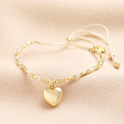A beige cord bracelet featuring a heart charmWith an added gold accent for sophisticationAn adjustable pulley fastening to slip on and offPair alongside heart themed jewellery Dimensions: adjustable can be worn at any length between 11.4cm to 23cmMade from: gold plated brass, glass beads, cord