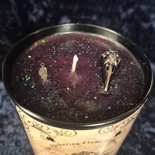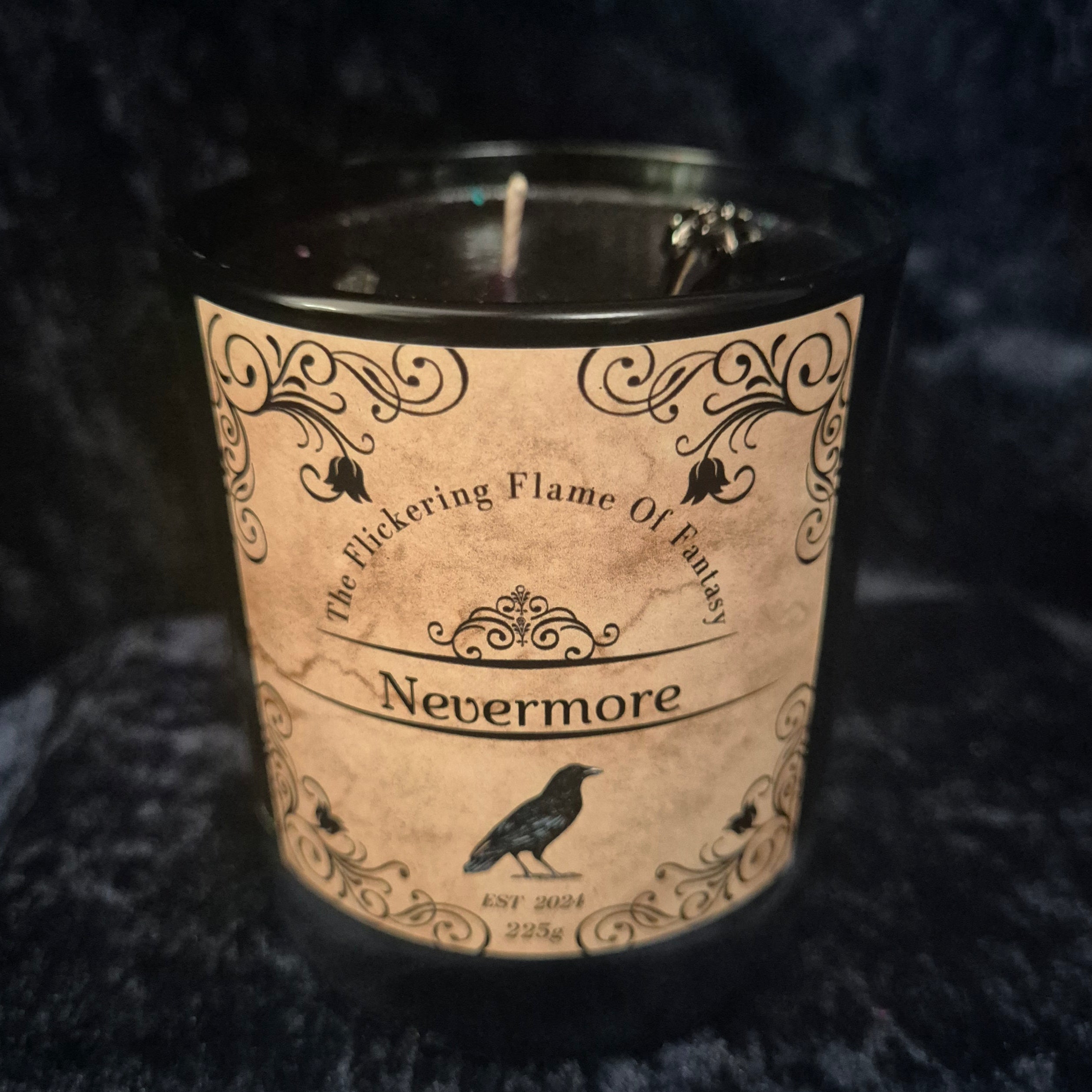 🪶 Nevermore | Story Card Included Inspired by Edgar Allan Poe’s Poem, The Raven Once upon a midnight dreary, while you wander lost in thought, a flicker in the dark invites you closer… Nevermore is a haunting tribute to Edgar Allan Poe’s timeless poem, a candle for those drawn to melancholy and mystery. This candle evokes the chilling beauty of solitude. A windswept chamber, a lone raven perched, and a heart caught between memory and madness. Its fragrance opens like a whispered verse: marine winds meet driftwood and sun-warmed shore, conjuring the stillness before a storm of sorrow. A tranquil scent cloaked in poetic gloom, perfect for moonlit musings and shadowed reveries. Adorned with symbolic charms and glimmering black eco-friendly glitter, the black surface of this 30cl candle reflects the eerie shimmer of candlelight dancing across a haunted room. 📜 Includes: A story card recounting the sorrowful tale of love, loss, and the raven that croaked “Nevermore.” Let the darkness speak. Let the poem breathe. Will you dare to light the flame?
