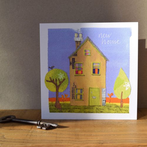 New home card illustrated in vibrant collage.