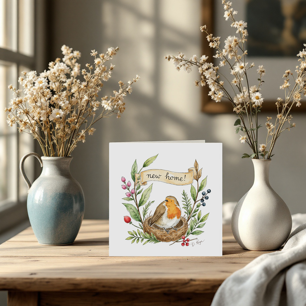 Welcome someone to their new home with this beautifully illustrated greeting card, featuring a charming robin nestled in a cozy nest, adorned with delicate floral details. Perfect for wildlife lovers and those who adore rustic, cottage-inspired designs. Design: Hand-painted watercolor illustration of a robin’s nest with vibrant greenery and berries. Material: High-quality, eco-friendly cardstock with a smooth matte finish.