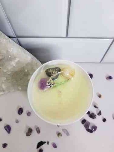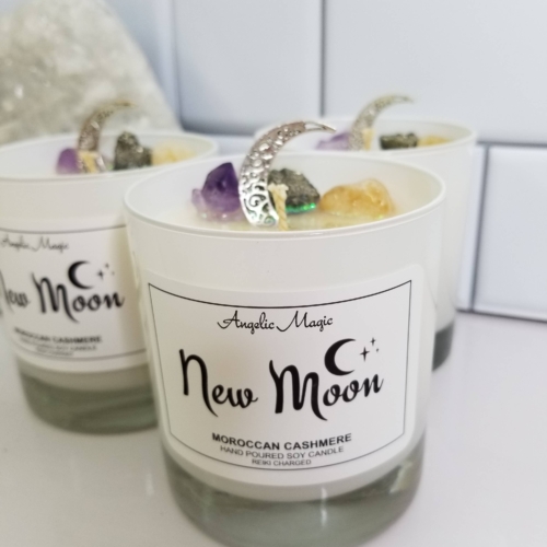 100% Natural Soy Wax & Cotton Wick11oz Glass Jar ( No Lid)Certified Non -Toxic Essential & Fragrance OilsReiki ChargedCrystals Amethyst, Quartz, MoonstoneScent – Moroccan CashmereTop – Powder, BergamotMiddle – Ylang-Ylang, Vanilla, Lavender, SugarBase – Sandalwood, Musk, AmberOur New Moon Crystal candle is scent-sational! This alluring, lightly scented candle is made of soy. Soy wax burns clean with no harmful soot, making it a healthier alternative to paraffin candles. The lovely fragrance will fill your room with freshness and harmony. Pyrite – Pyrite is a powerful protection stone which shields and protects against all forms of negative vibrations and/or energy, working on the physical, etheric, and emotional levels. It stimulates the intellect and enhances memory, helping to recall relevant information when needed.Amethyst – Amethyst is said to offer protection, humility, spiritual wisdom, and stress relief.Natural Citrine is a premier stone of manifestation
