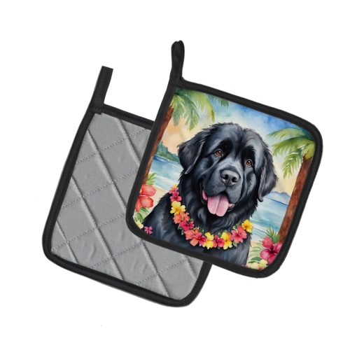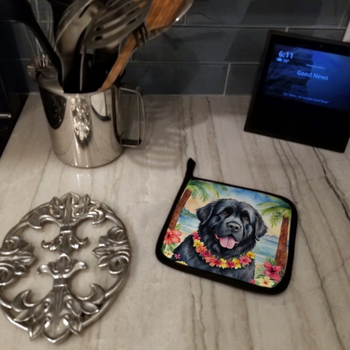 Pair of Pot Holders featuring breed specific Newfoundland artwork. A Pair of Pot Holders to match your kitchen decor. Made in the USA these are thick and functional. Full color artwork decorates the front polyester fabric of the hot pad and accented by a black trim. Use these at as a trivet for your Thanksgiving or Christmas tablescape. Filled with insulated fabric and quilted for durability. These colorful pot holders will make a great gift for your favorite home cook or executive chef. Each pot holder measures approximately 7 1/2 inches by 7 1/2 inches. A hanging tab is included.