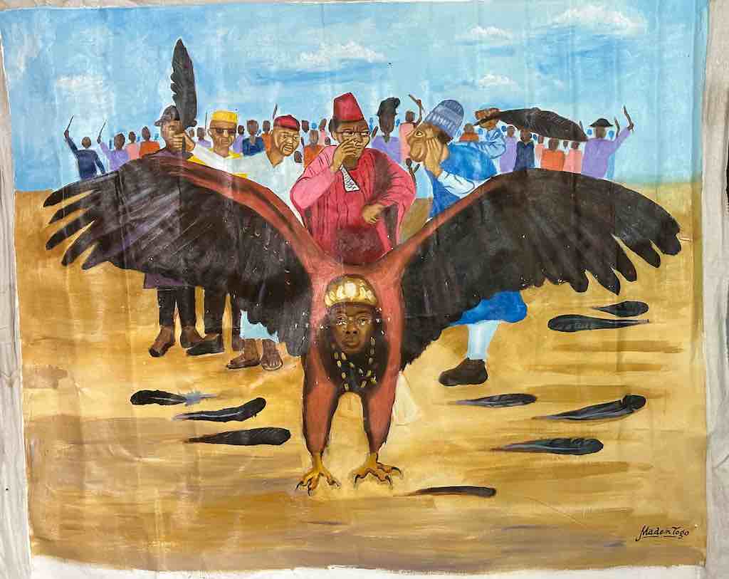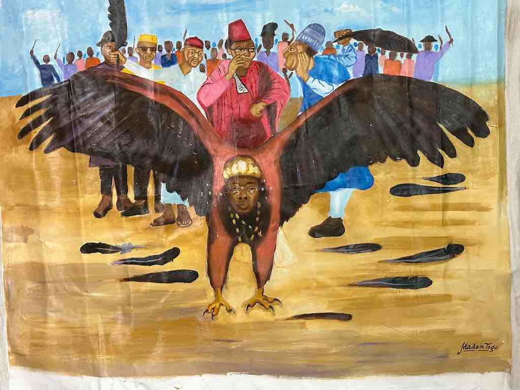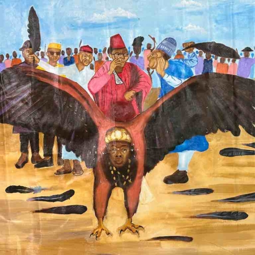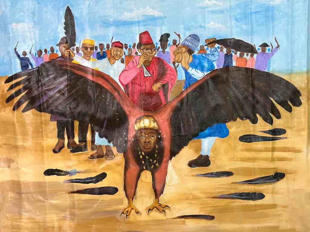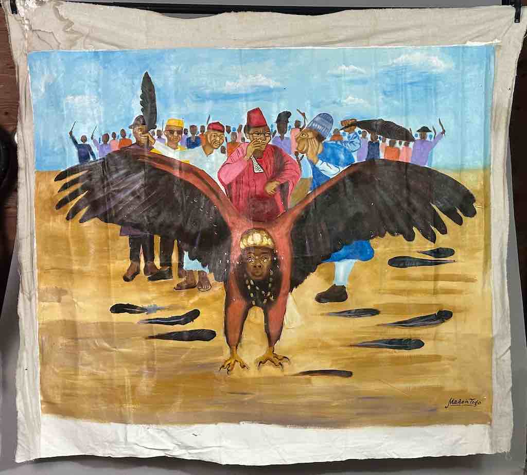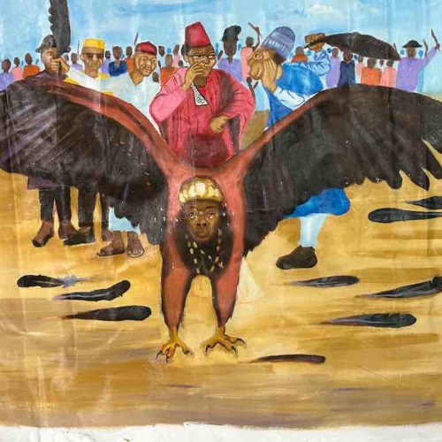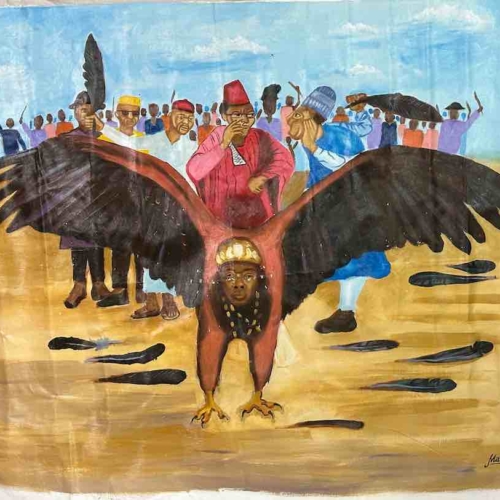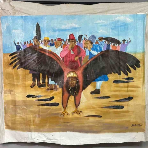 Hand Painted in Nigeria, Africa, this painting is a parable in which the eagle represents Nigeria. Some people in the crowd behind the eagle are holding feathers they have plucked from the bird. The message is that if the Nigerian people do things to damage the country, if they do not support the country that it will not fly. It will not prosper.The overall dimensions of the canvas are 47 x 42″ (119 x 107 cm). The painted area measures 43 x 35″ (109 x 89 cm).