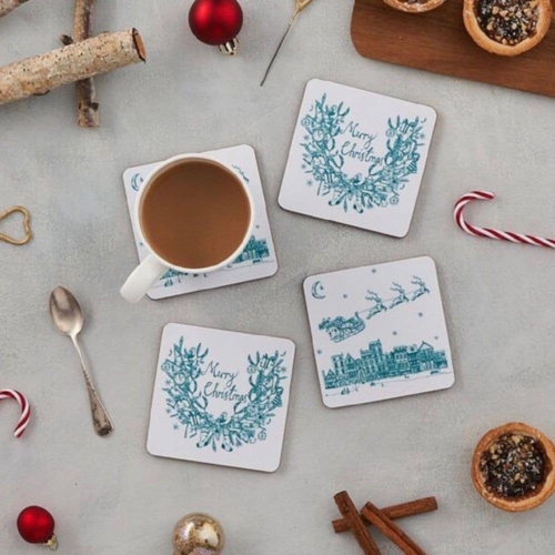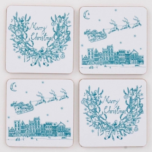 Handmade in Britain. Printed onto eucalyptus board with a matt laminate finish and cork back.Dimensions: 98 x 98mm / 3.85″ x 3.85″.Washing: Wipe clean with a damp cloth, do not immerse in water. Suitable for warm mugs only.Keywords: Night, Christmas, festive, merry, sleigh, santa, father christmas, wreath, city, snow, cup, mug, coffee, tea, living room