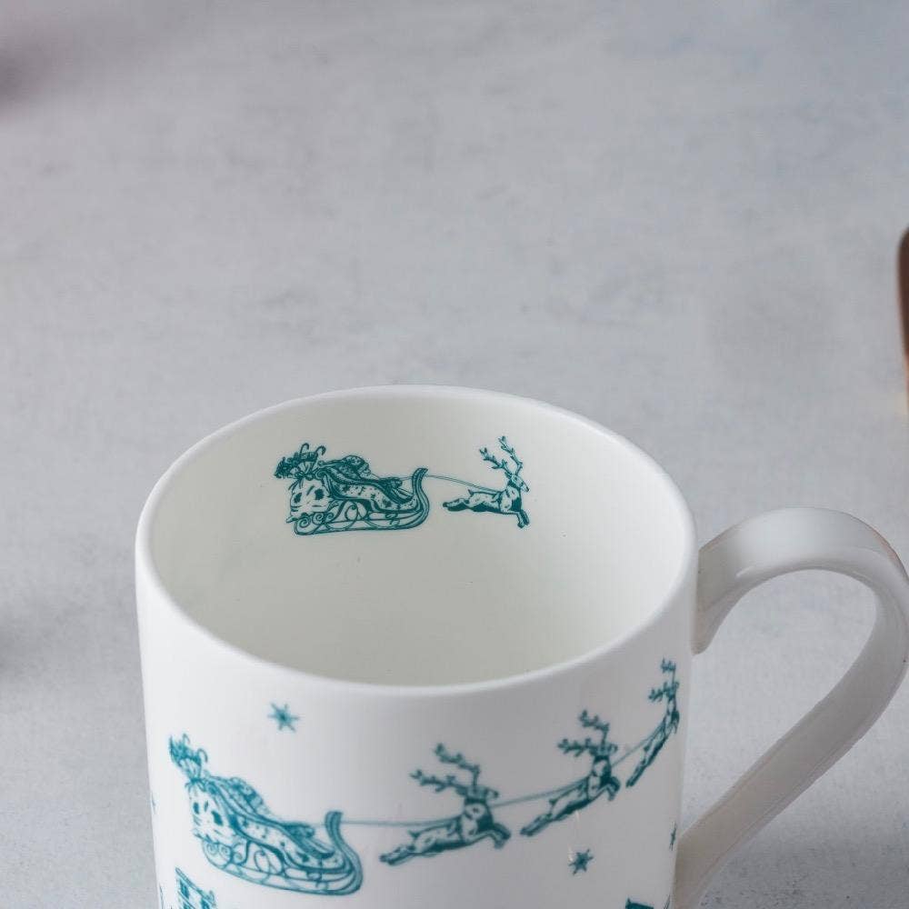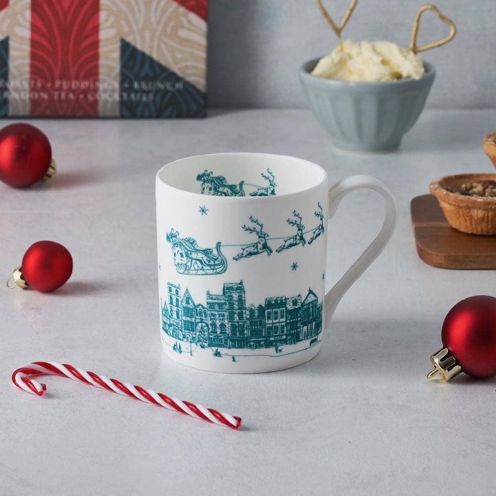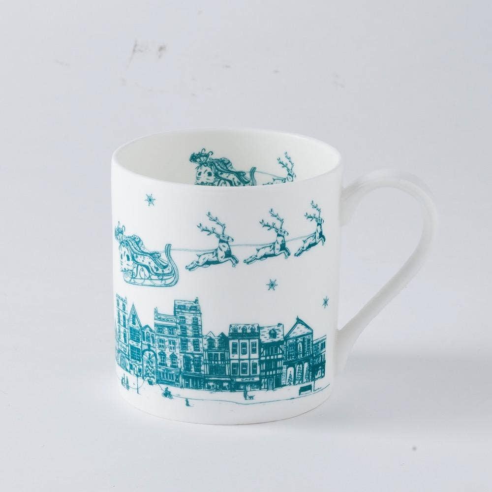 Hand decorated in Britain, printed onto on fine bone china. Dimensions: 8.5(d) x 9(h)cm.Capacity: 380 ml (400 ml when filled to the rim)Washing: Dishwasher and Microwave safe.This item comes bulk packed in a protective cardboard carton. Not individually boxed. Presentation boxes for mugs are available separately. Keywords: Night, Christmas, festive, merry, sleigh, santa, father christmas, wreath, city, snow, cup, mug, coffee, tea, hot drink, kitchen, breakfast