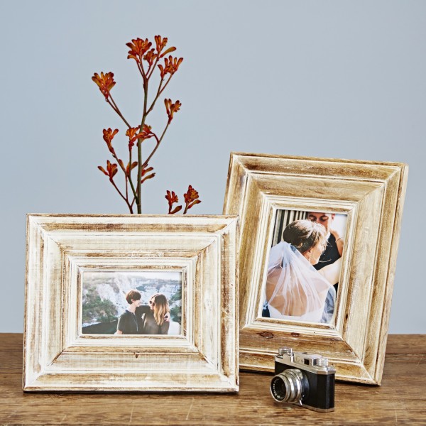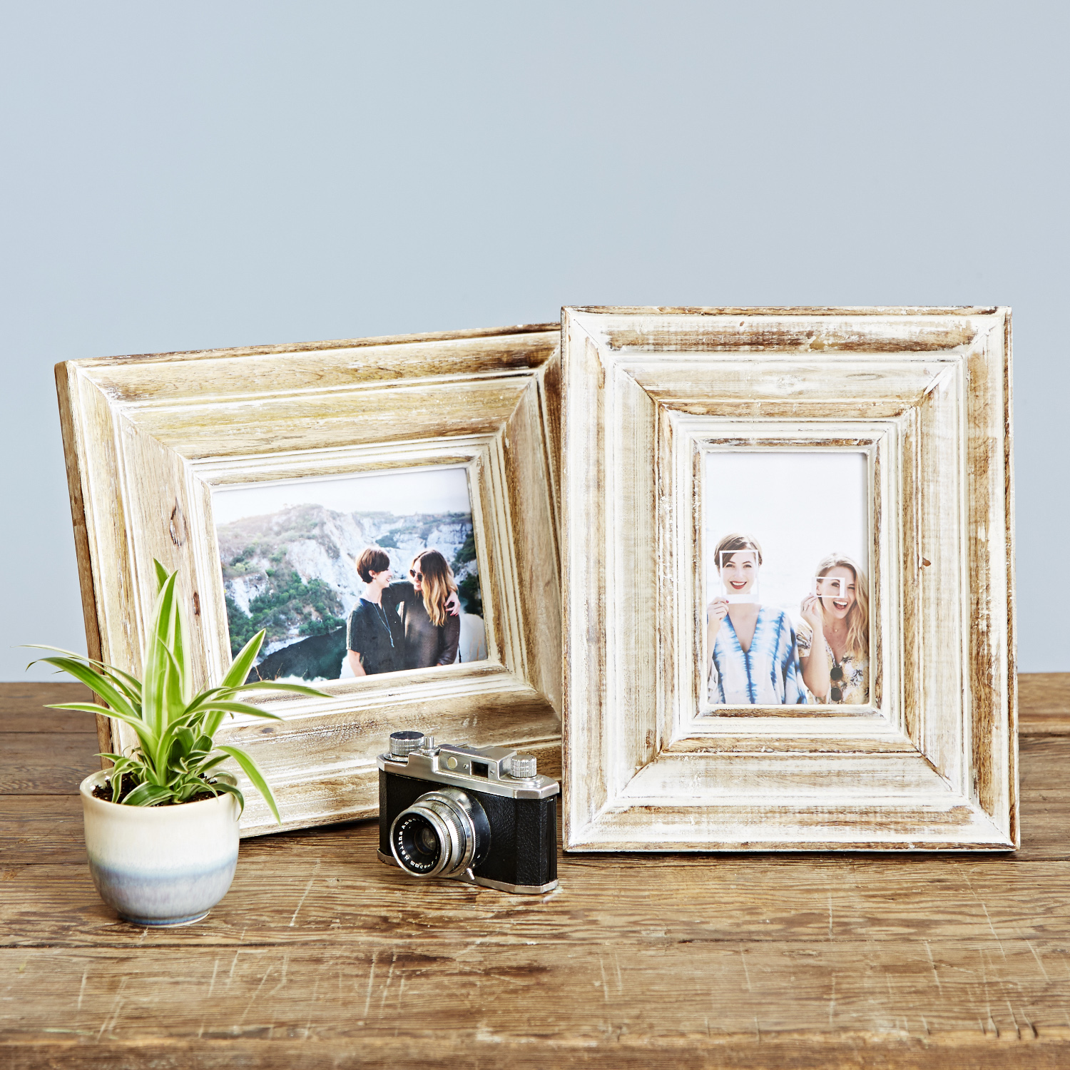 This simple, elegant frame is hand crafted from mango wood and finished with a distressed antique white paint. Fill it with your favourite photo or share it with a loved one for a thoughtful birthday, new home, or wedding gift.