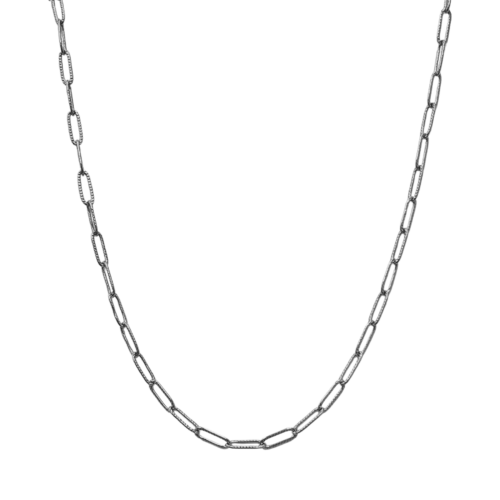 A little extra texture gives this simple paperclip chain pizazz. The perfect piece for everyday wear.- Rhodium plated stainless steel chain.- 16″ L plus 1″ extender- Handcrafted in CaliforniaStainless chains have heat-adhered heavy plating and coating and are tarnish and fade-resistant.
