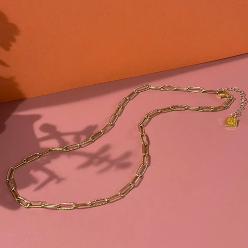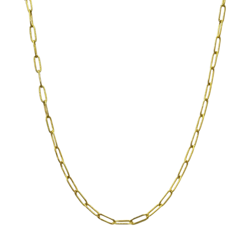 A little extra texture gives this simple paperclip chain pizazz. The perfect piece for everyday wear.- “Vintage Gold”plated stainless steel chain.- 16″ L plus 1” extender- Handcrafted in CaliforniaStainless chains have heat-adhered heavy plating and coating and are tarnish and fade-resistant.