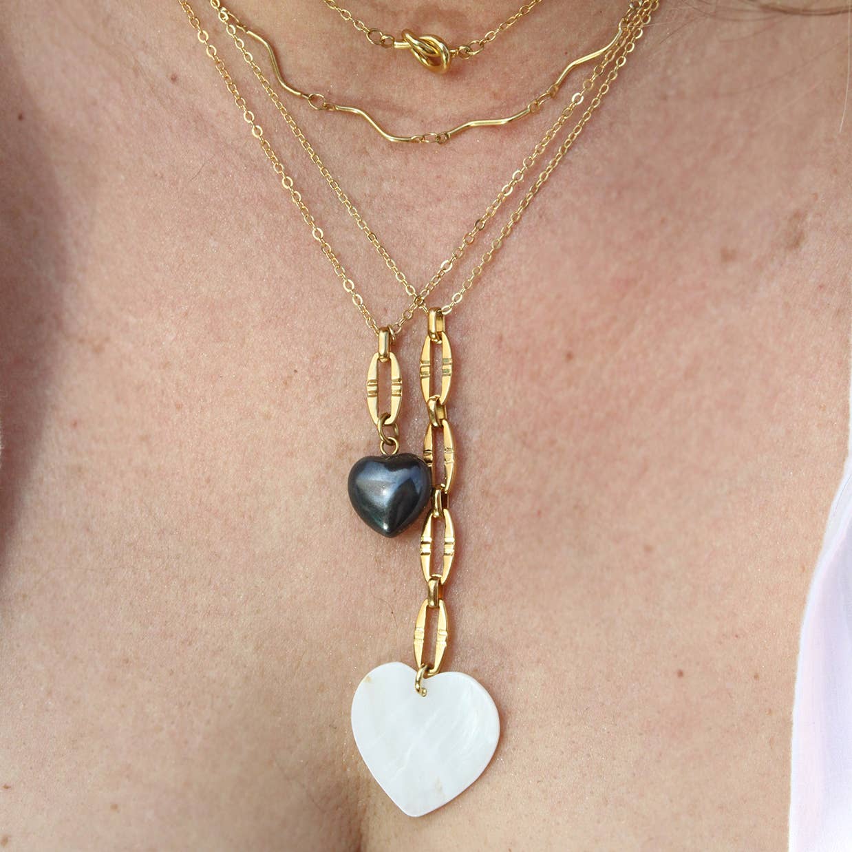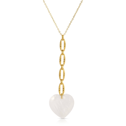 Express your love with timeless elegance through our “Te Amo” Mother of Pearl Heart Y-Necklace. Featuring a stunning mother of pearl heart pendant and mixed gold-plated stainless steel chains, this necklace is a beautiful tribute to romance and sophistication.-“Vintage Gold” Ion-plated stainless steel chain-Mother of Pearl Heart 1″-16-18″ l length 3.5″ drop-Handmade in California