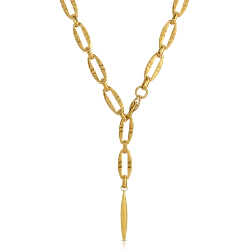 We’re loving the vintage heirloom vibes this chain is giving and a sexy point for a little added edginess. This necklace fastens to itself in the front creating an adjustable Y-necklace. * 18k Gold Plated Stainless Steel Point * “Vintage” Gold Stainless Steel Chain * 24″ Total length (adjustable) * 1″ point -Handmade USA * Stainless steel chain is tarnish & fade resistant