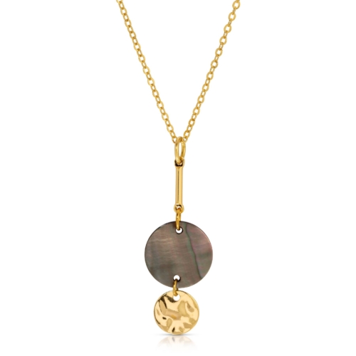 Crafted with care and precision, the Este necklace captures the essence of minimalist sophistication. The black lip shell pendant is delicately set on a fine chain, creating a refined and elegant look that stands the test of time.-Gold plated, e-coated brass chain-Black Lip Shell disk-Gold plated, e-coated disk-16-18″ l length -Handmade in California