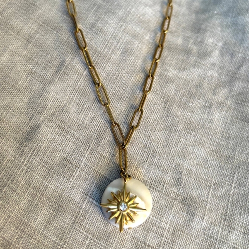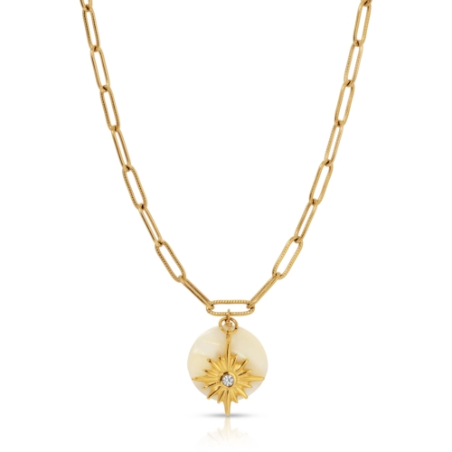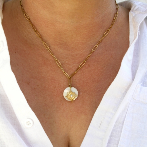 Moon and Stars align in perfect balance in our newest celestial collection piece. A sparkly shining star pendant shines framed with a hand wire-wrapped mother of pearl pendant.-3/4″ star pendant with cz in gold plated stainless-Mother of pearl disk bead-18k gold-plate stainless paperclip chain-17″ +2″ extender -Handmade in California