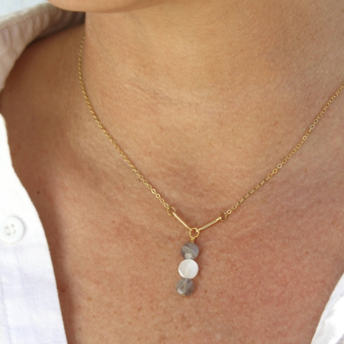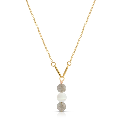 This lovely minimal necklace features a trio of cascading labradorite and mother of pearl. -18k gold-plated brass chain-labradorite and mother of pearl beads-16-18″L-Handmade in California
