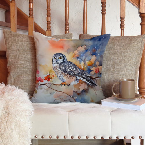 Throw Pillow featuring breed specific Northern Hawk Owl artwork. Add a touch of vibrancy and comfort to your outdoor seating with Caroline’s Treasures Fabric Decorative Pillow. Measuring approximately 14 inches by 14 inches, this outdoor pillow is crafted to elevate the appeal of your patio furniture, infusing it with vivid color and artistic flair. The pillow includes a 100% Polyester Fabric sham filled with a quality pillow form to provide superior comfort. Innovatively made from our brand new material, specifically woven for its water resistance, this pillow is designed for durability. The soft canvas fabric offers versatility in use, fit for your indoor couch or your outdoor patio, porch, or veranda. The fabric is dyed with colorfast dyes built for resilience against weather conditions, ensuring the pillow retains its beauty over time. Constructed by sewing three fabric pieces to create a sham, the polyester insert is then nestled inside to form the pillow, resulting in an overstuffed pillow that maintains its shape. Both the sham and the pillow insert are proudly made in the United States. As the pillows are handcrafted, there may be minor variations in size, further enhancing their unique charm. Experience comfort in style with Caroline’s Treasures Fabric Decorative Pillow.