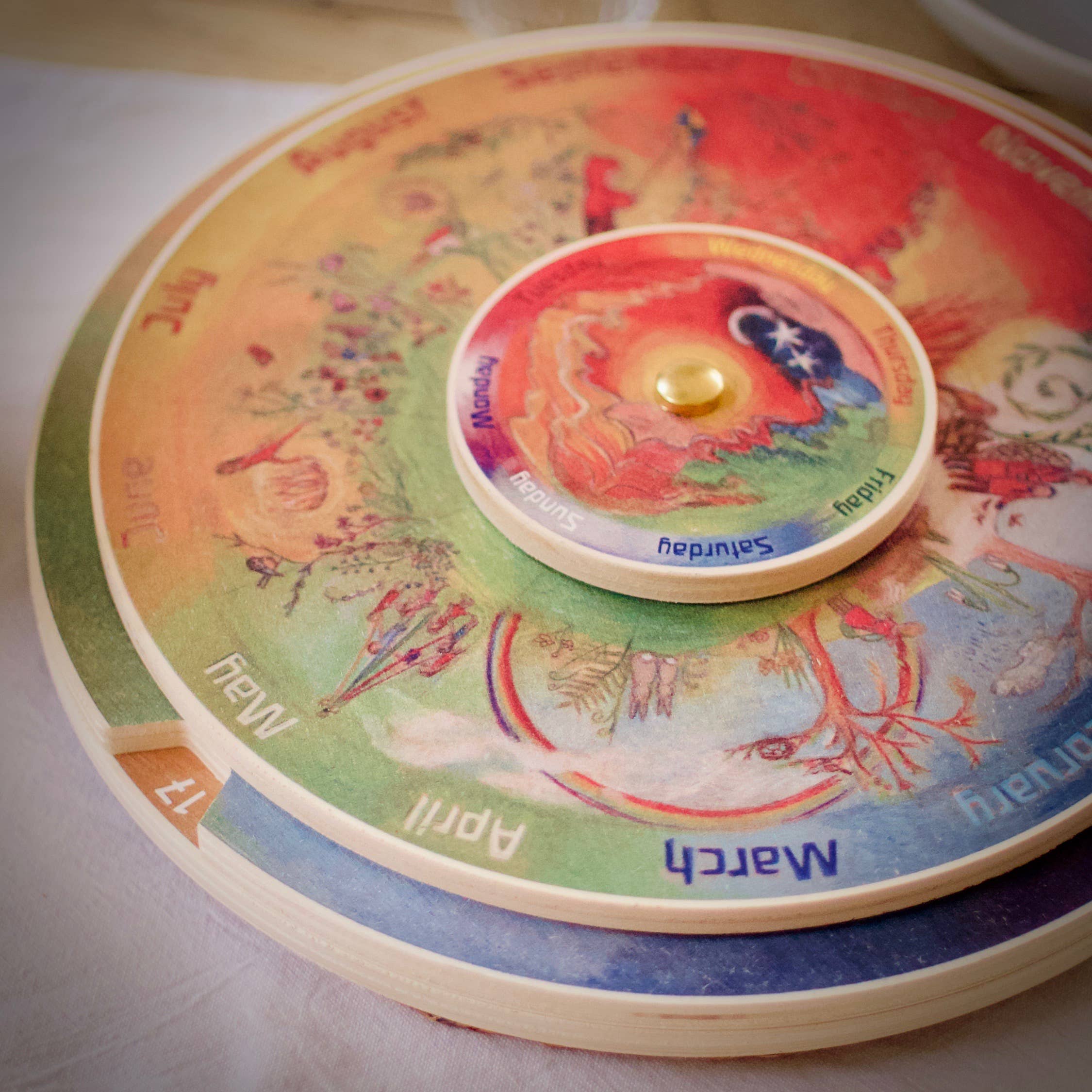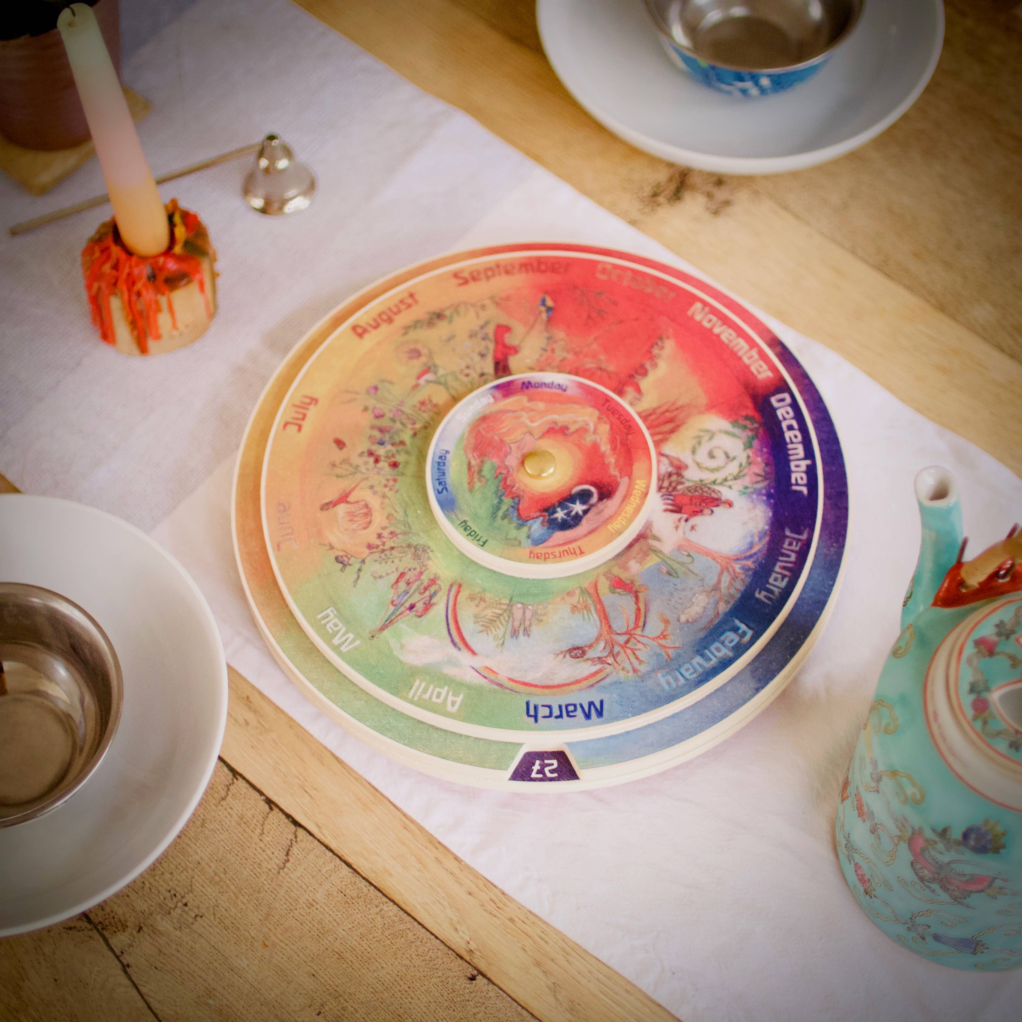This beautiful Wooden Perpetual calendar displays all the months and the beauty of the seasons as the year passes, with the date and day of the week being easily rotated each day. The illustration includes many traditional festivals, animals, wild plants and flowers.