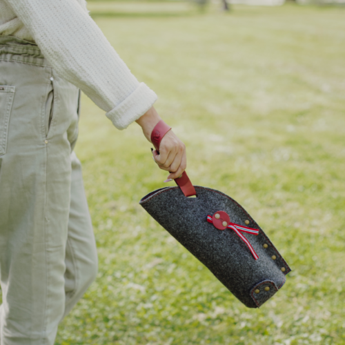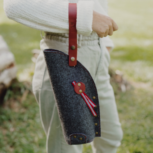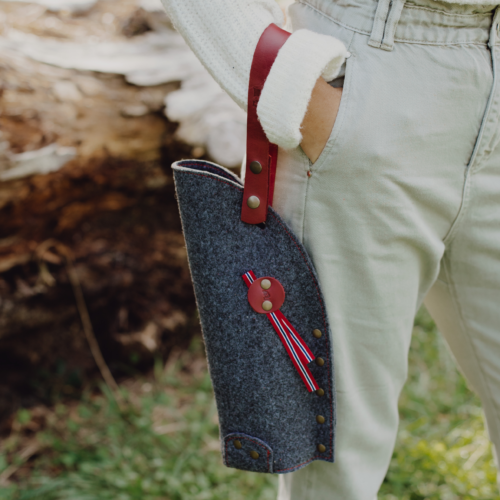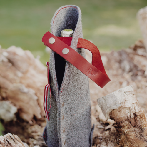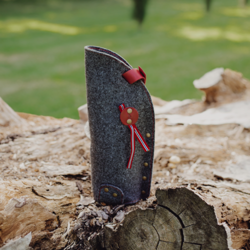Bottle holder handcrafted in 5mm dark grey felt with 2mm thick natural red leather details. (It incorporates a ribbon with the Norwegian flag).