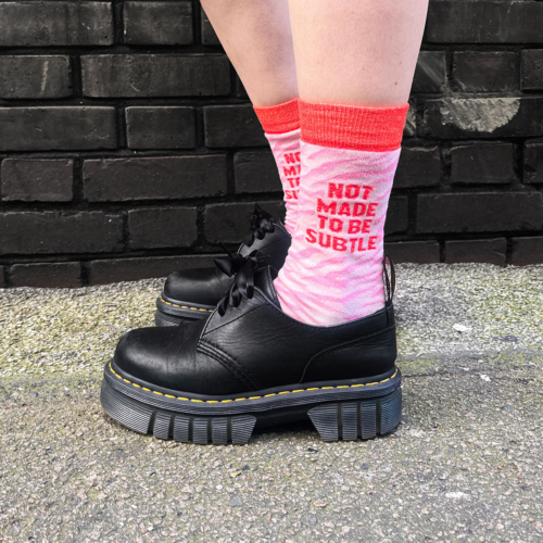 Make a statement and take up space with some loud statement socks! Featuring pink tiger stripes and a touch of glitter, they’re serving dopamine dressing for your feet… Why you’ll love ’em One size, women’s fit calf socks Plastic-free, recycled packaging Every purchase helps a woman or girl in need Free UK & EU shipping on all orders over £70! Checkout with Shopify Payments and Paypal for 100% secure and safe transactions. We want you to love your items, so if anything you buy isn’t perfect, just let our friendly support team know over live chat and they’ll do everything in their power to fix the problem or give you a full refund. Product Specs: UK size 3-6 EU size 36-39 Made from 80% Cotton 15% Polyamide, 5% ElastaneMachine wash cold on gentle cycle, do not bleach or tumble dry