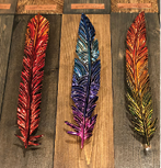 Mounted copper feathers hand tinted in a wide variety of colors mounted on various wood boards in shades of brown + gray, smooth + rough cut.