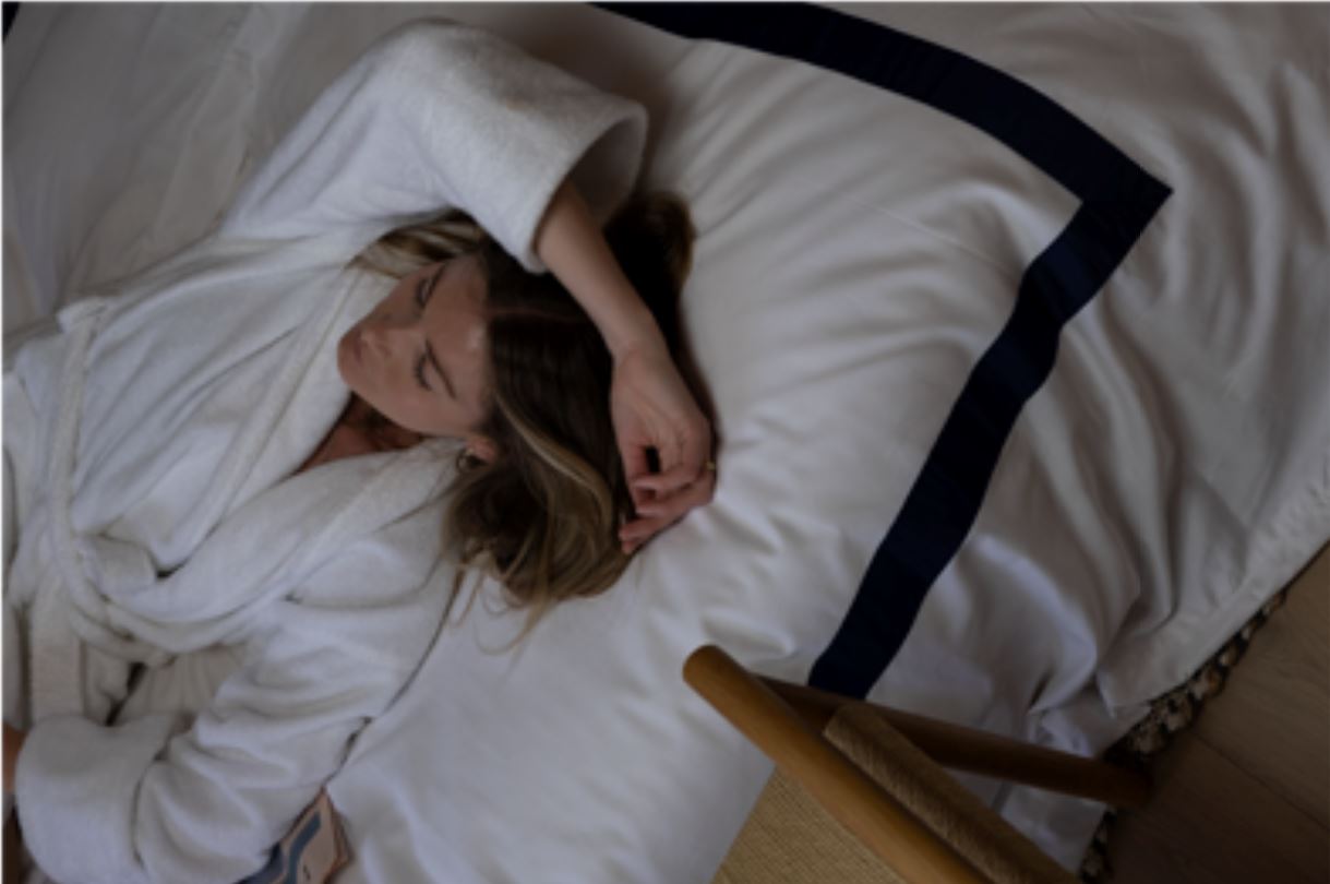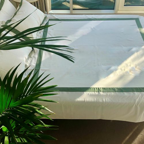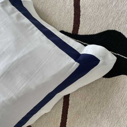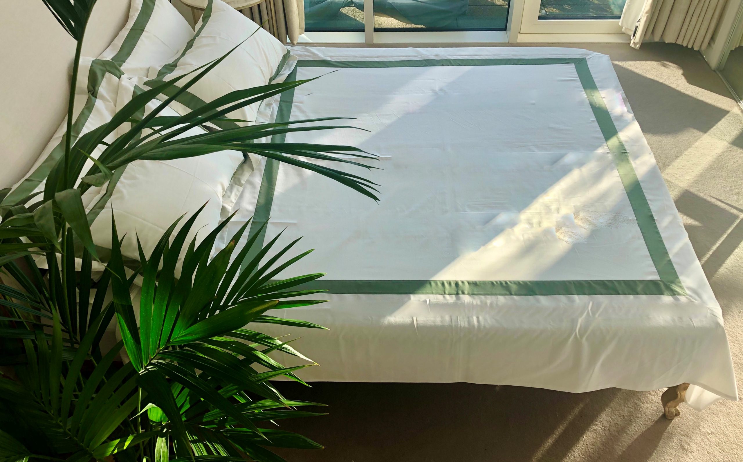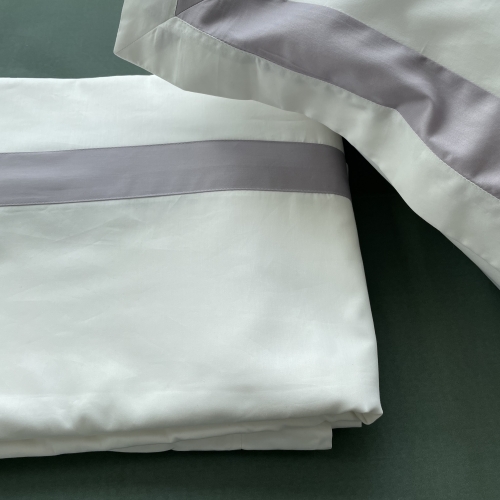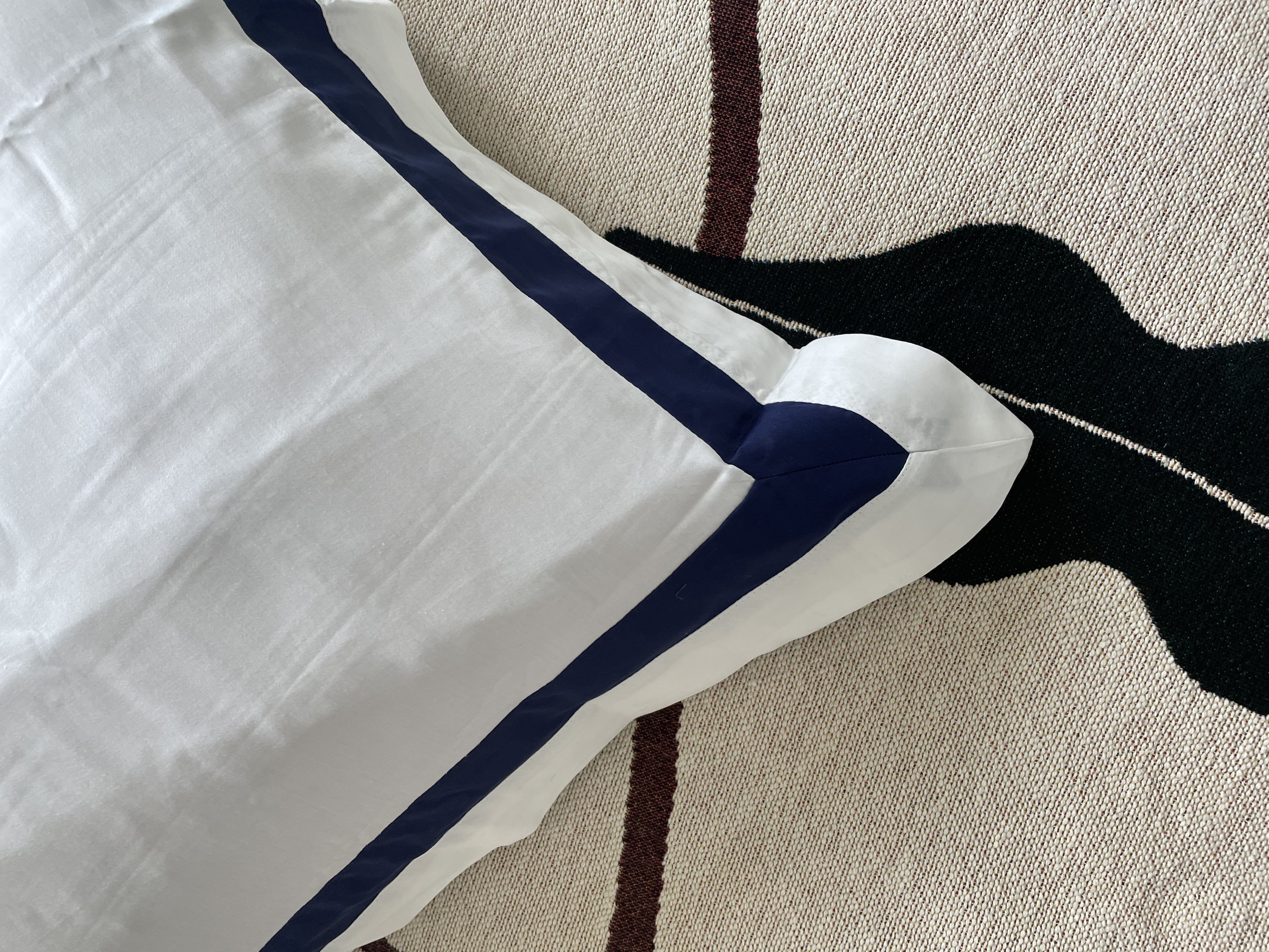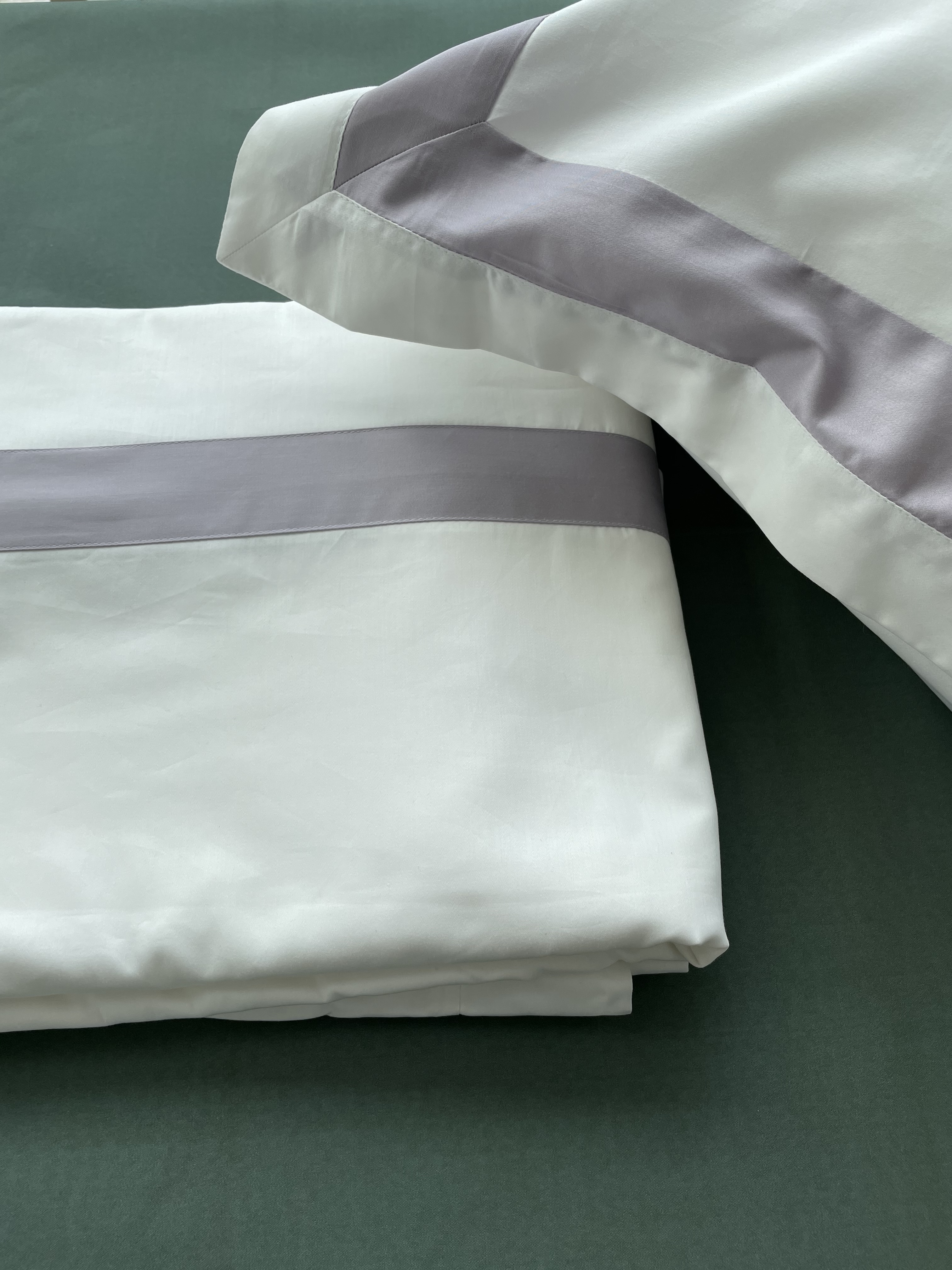 White bedding with a rich Navy blue OR Lilac edging option in 400 thread count, buttery soft cotton (sateen weave)