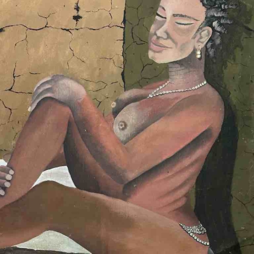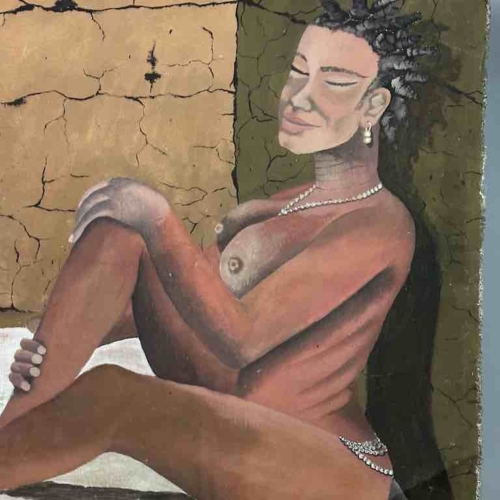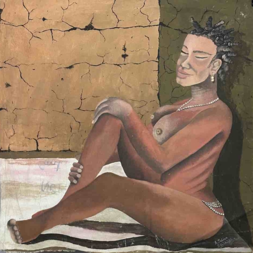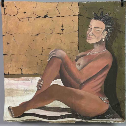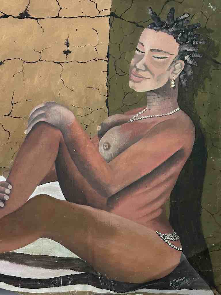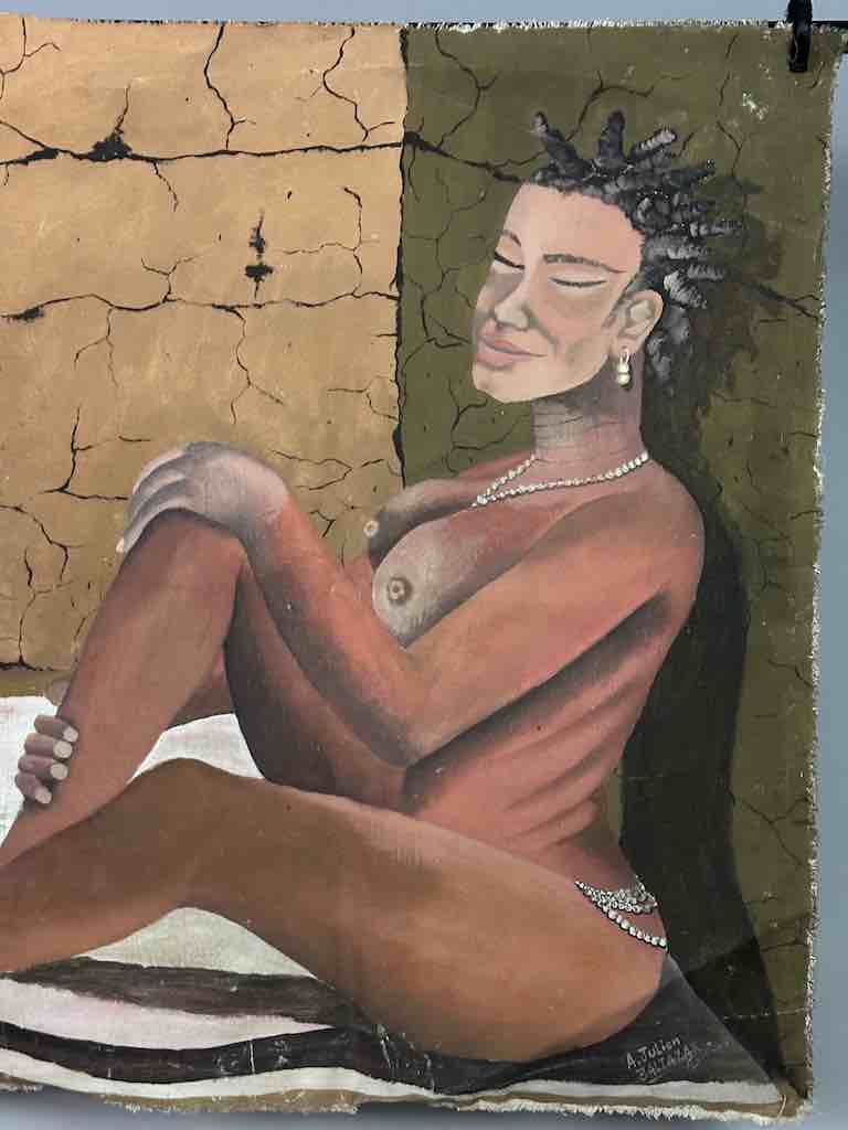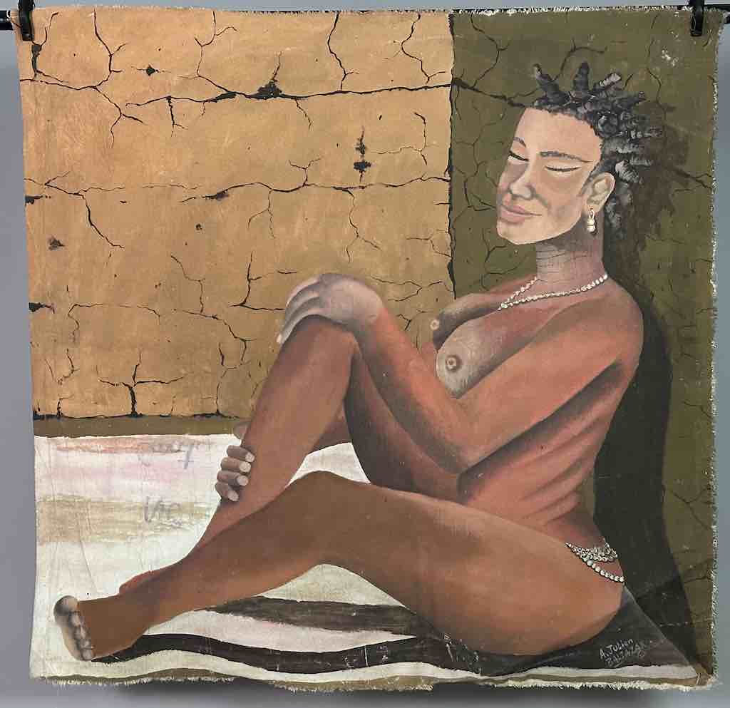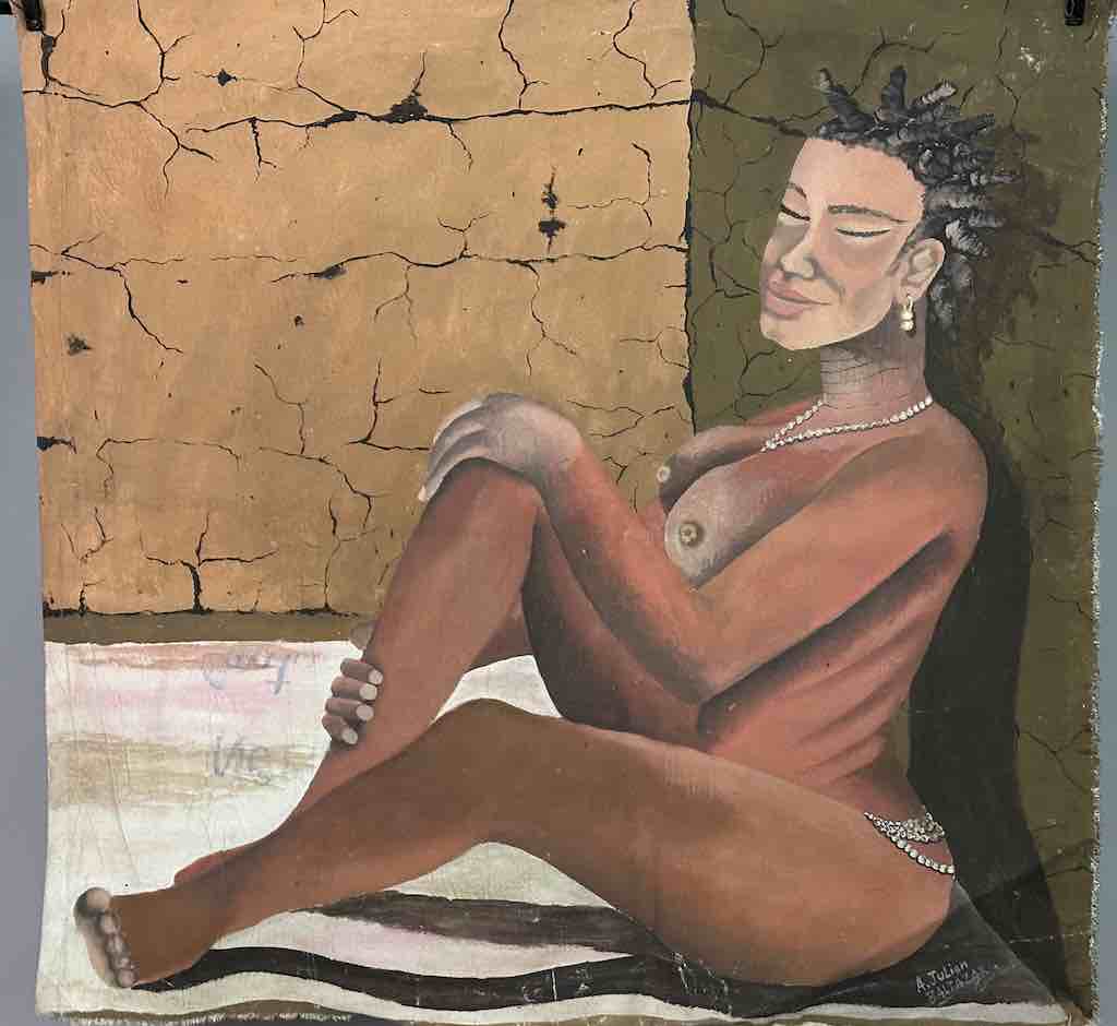 Original artwork, hand painted oil on canvas in Togo, Africa, by a member of a cooperative of artists in Lome, the capital city of Togo. The canvas is a flour sack.This painting measures 31 1/4 x 30 3/4″ (79 x 78 cm).