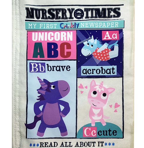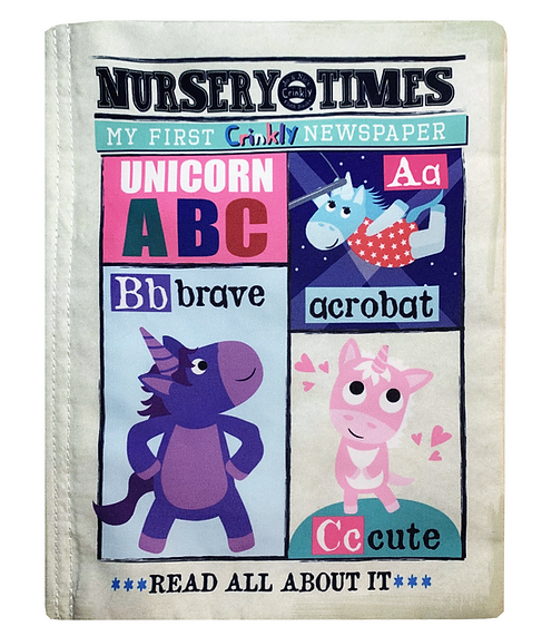 Nursery Times Crinkly Newspaper. Counting to 10 and countdown from 10 – 1 in Space. 6 pages of Space themed illustrations. Dimensions approx: 30cm x 20cm. CE tested and machine washable. A practical, lightweight cloth book with crinkly pages. A great sensory toy. A unique gift. Each newspaper is packed in a gifting envelope to add ‘To’ and ‘From’ and a short message.