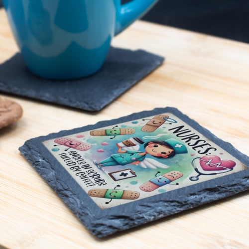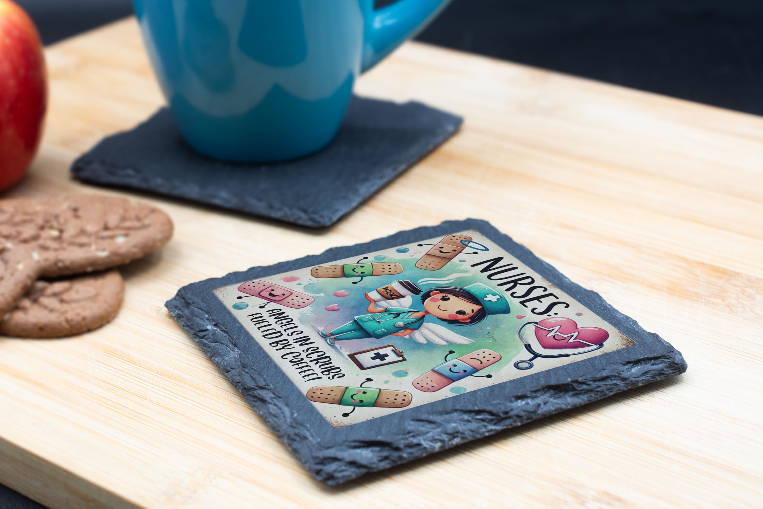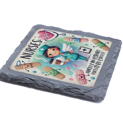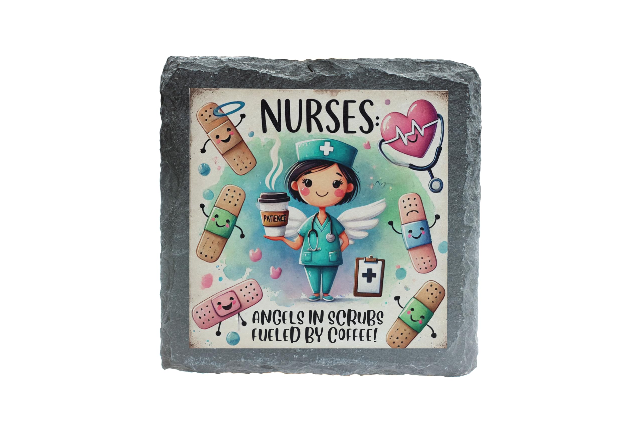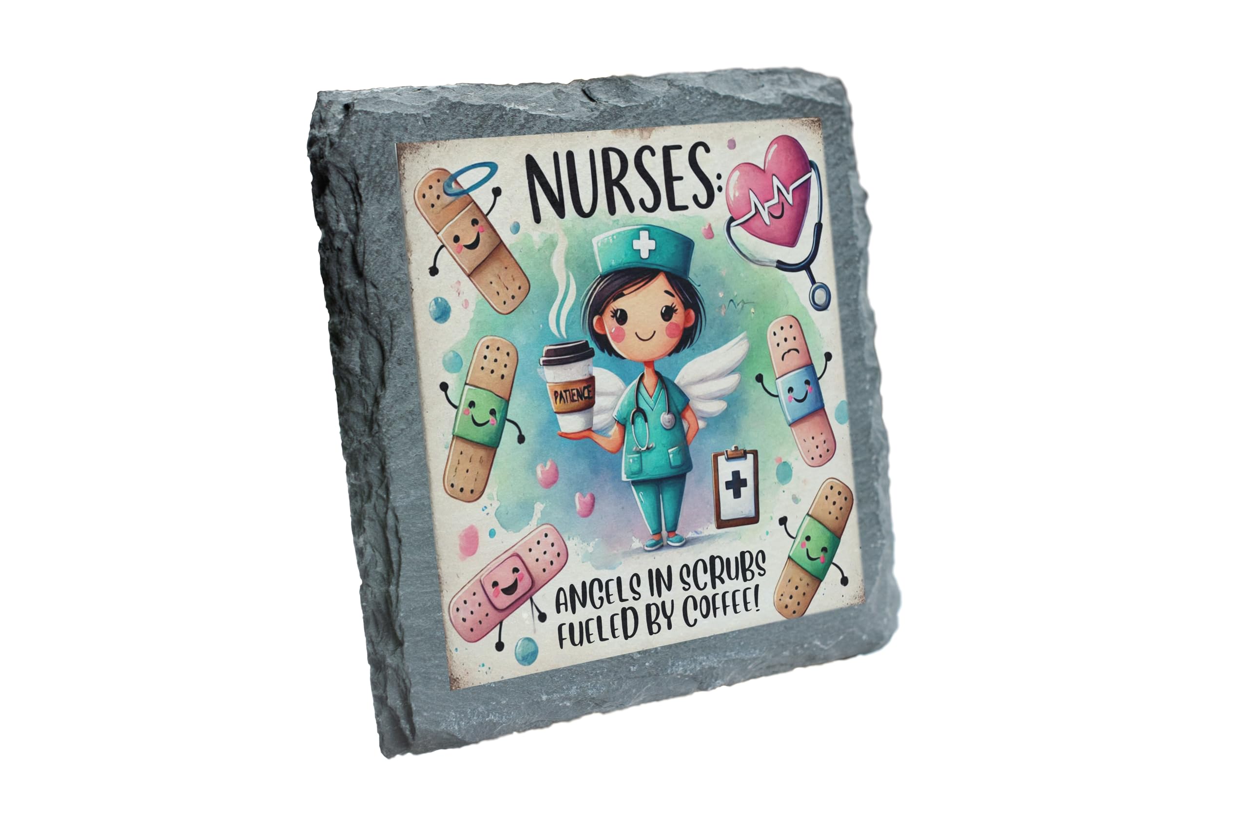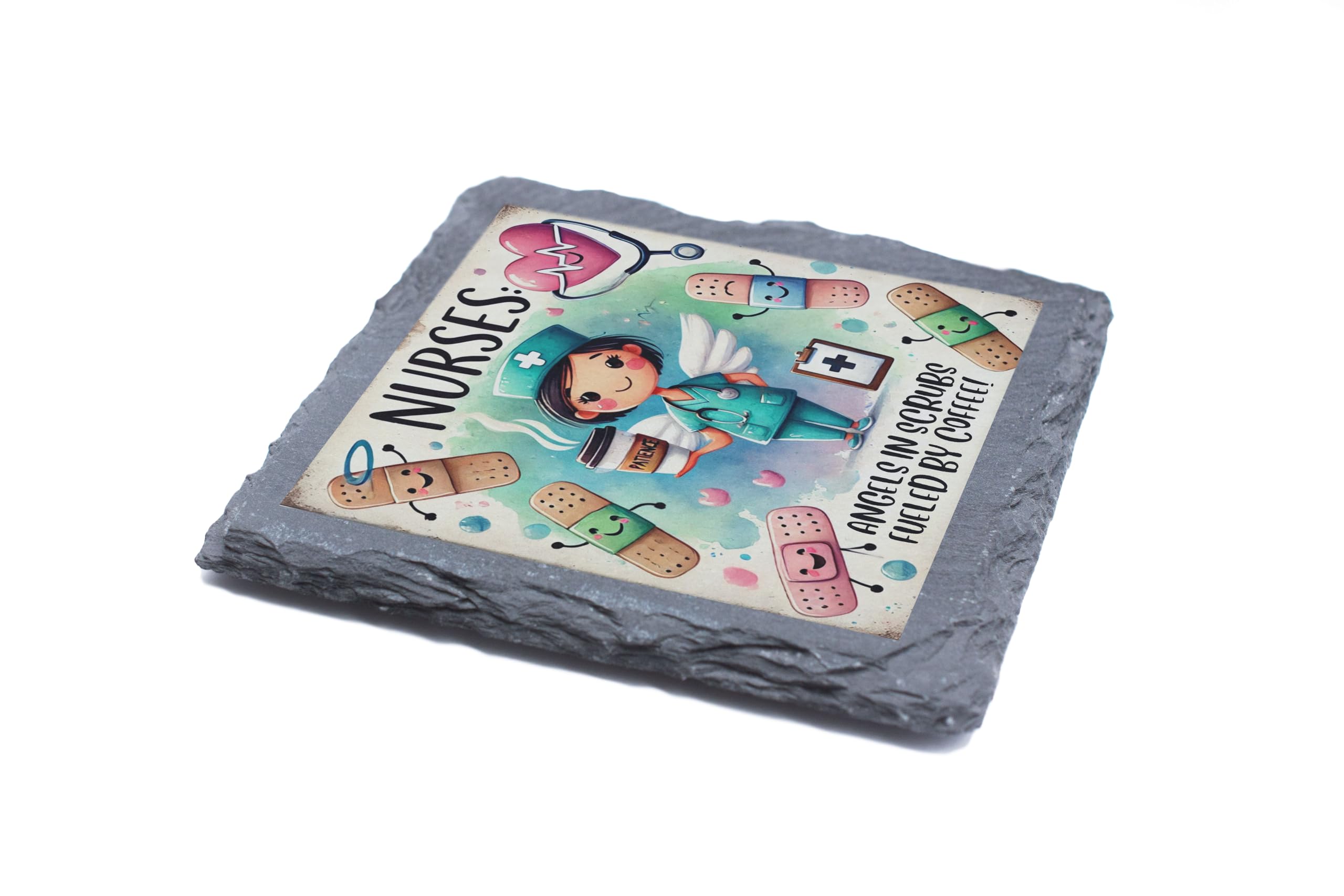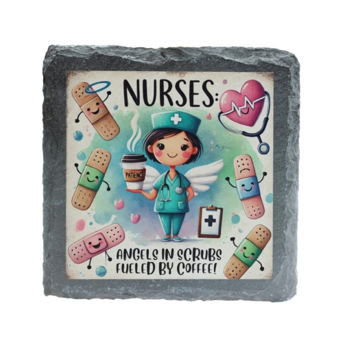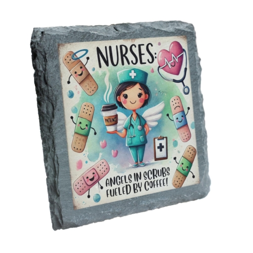 Celebrate the dedication and compassion of nurses with this Nurses Slate Coaster, featuring the heartwarming phrase “Angels in Scrubs Fueled by Coffee.” The cheerful design showcases a caring nurse with wings, surrounded by adorable medical-themed illustrations, making it a perfect blend of appreciation and style. Crafted from durable slate, this coaster not only protects your surfaces but also serves as a delightful reminder of the tireless efforts of nurses. Whether as a gift or a personal decor piece, this coaster is sure to bring a smile and a sense of pride to any healthcare professional! Heartwarming Design: Features an angelic nurse in scrubs with wings, surrounded by cheerful bandages and medical symbols. Durable Slate Material: Made from high-quality slate, ensuring long-lasting use while protecting your surfaces. Perfect Gift for Nurses: A thoughtful and unique gift for nurses, healthcare workers, or anyone in the medical field. Charming Decor Piece: Adds a touch of warmth and humor to any coffee table, desk, or workspace. Practical and Stylish: Combines functionality with an inspiring design, perfect for keeping drinks in place and spirits high.