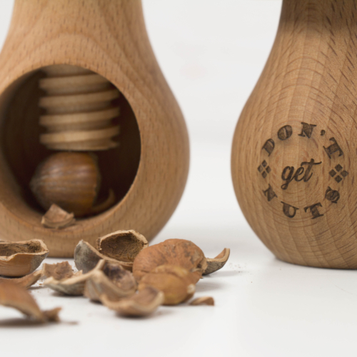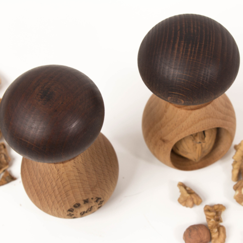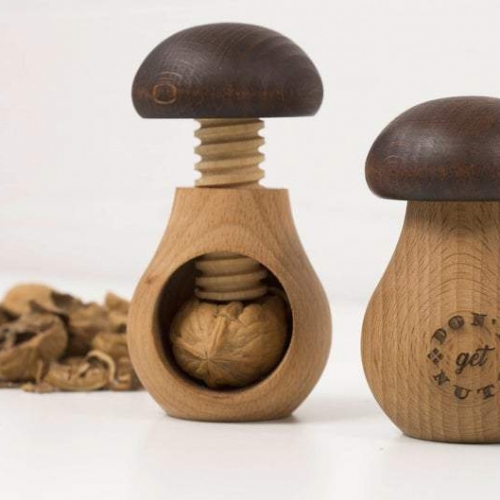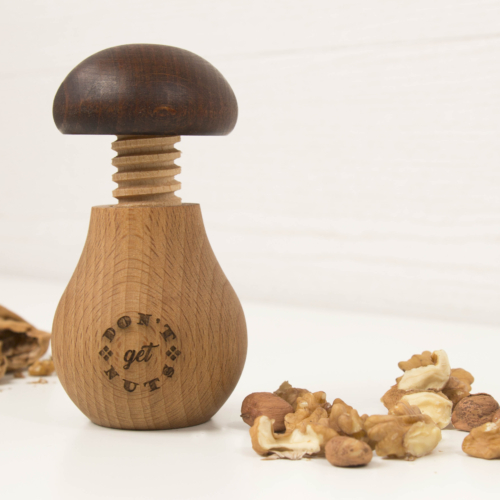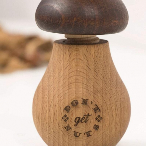 This is a handmade wooden nutcracker in the shape of a mushroom with funny engraving: DON’T GET NUTS! It is made from solid ash tree wood, has a dark brown colored pin/head and natural wood color base. It can serve as a lovely kitchen decoration.