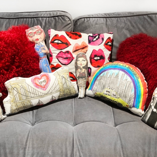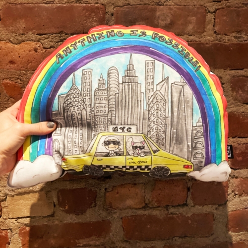 Digitally printed original artwork by KahriAnne Kerr of the NYC Rainbow on cotton/linen fabric. Solid black linen back. Size 11.5″ H x 15.75 “W. Poly Fill inside. Printed with eco-friendly inks in the USA. Made with love in NYC.
